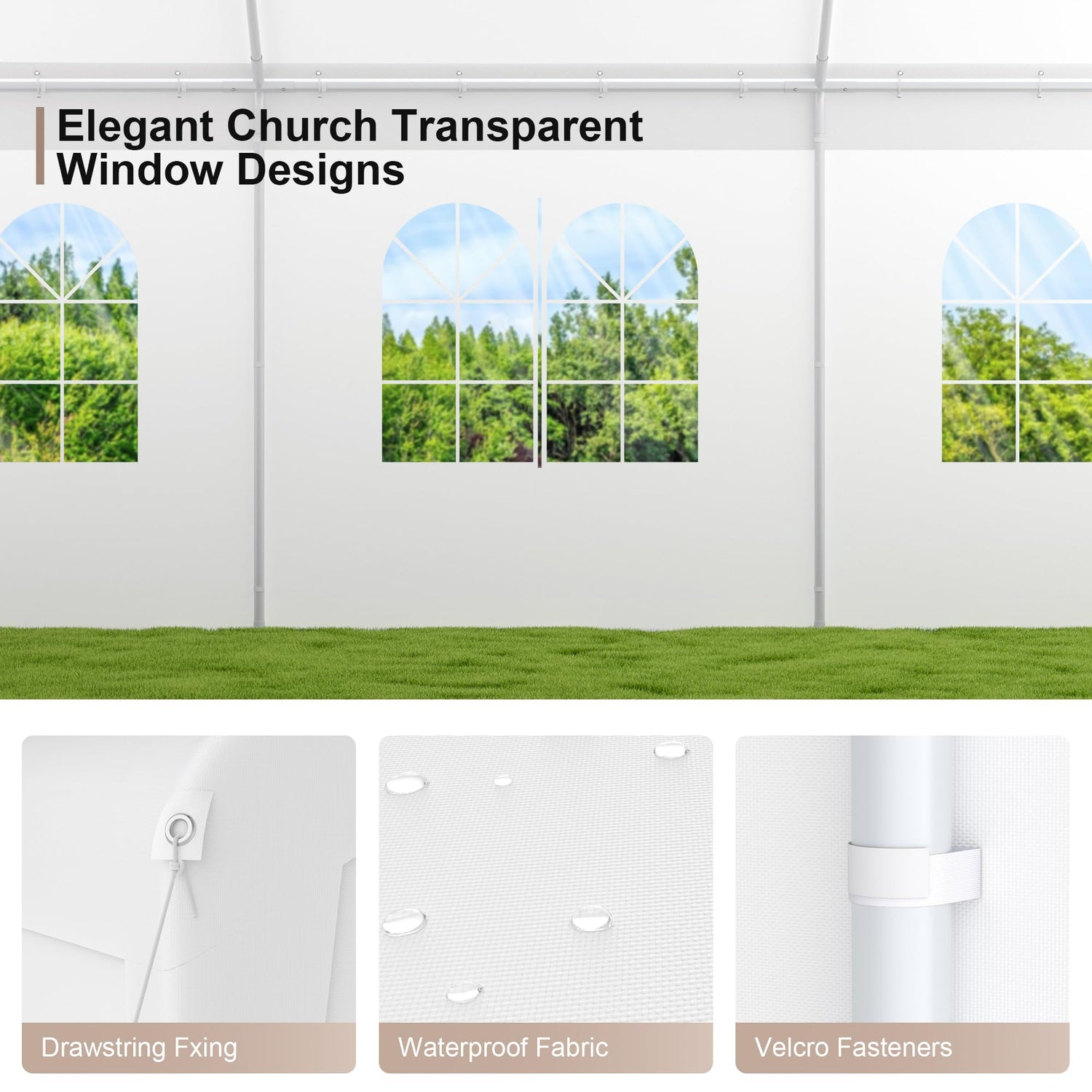 - 【Weather Resistant】Our large party tent is made of 180g three-layer PE fabric, which is waterproof, UV resistant, and tear resistant. It is an ideal supplement to any outdoor environment. In the hot summer, it can prevent ultraviolet rays from entering your gathering space. Cathedral style windows provide ample lighting, but do not make sunlight a thorn in the eye.