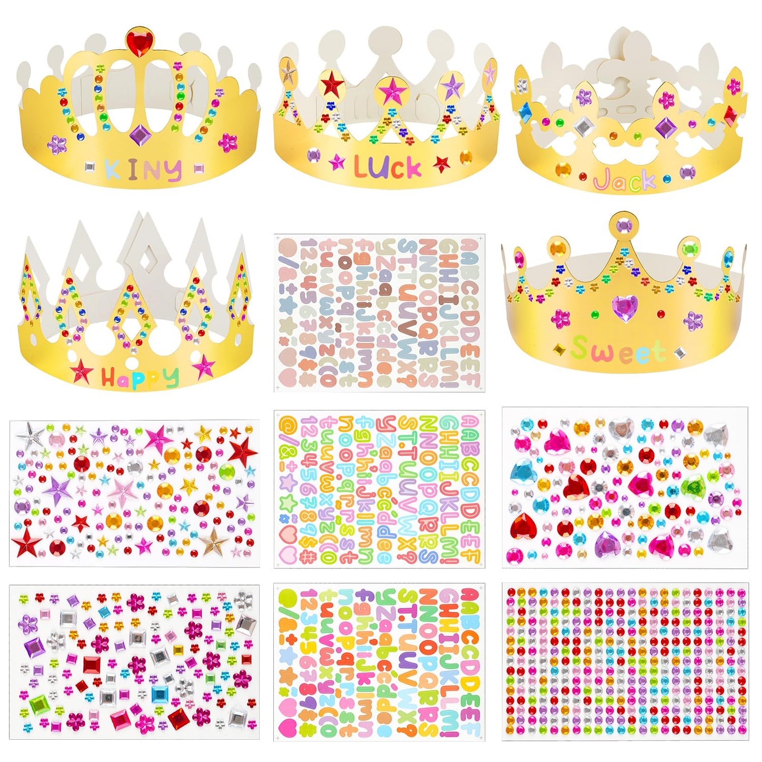 - Rich Gold Paper Crown Set: You will have 15 paper crowns in 5 styles, 13 decorative letter, number and gem stickers. The variety of stickers and gems is perfect for personalizing each crown, letting every guest create their own unique design