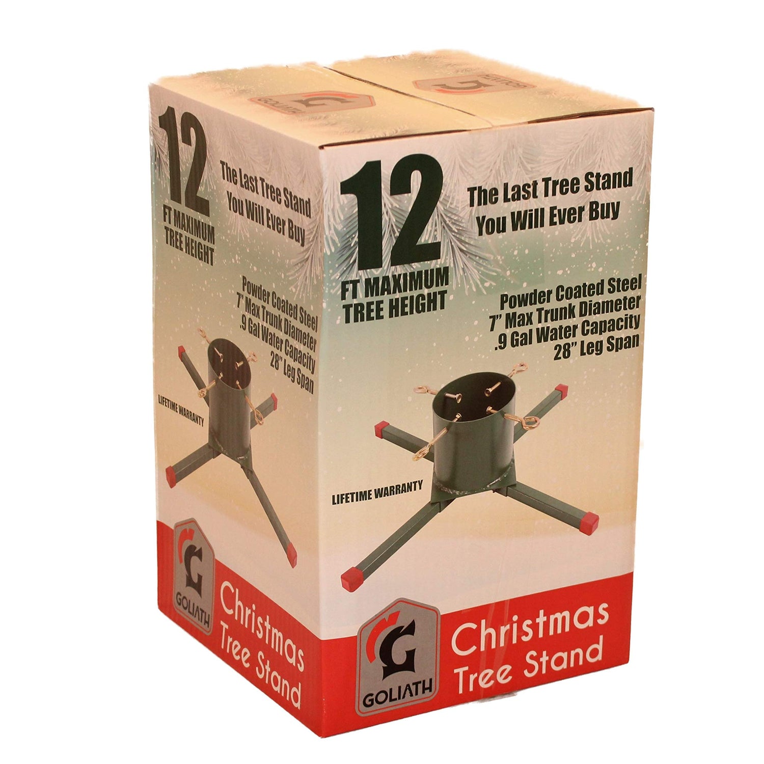 Details: GTS-728 Assembled Size 28 x 28 x 8.25 inches Raises tree height 2 inches Branch clearance needed 6 inches Max Trunk Size 5.75 inches Water Capacity without trunk .9 gallons Powder Coated Heavy Duty Steel Lifetime Warranty Goliath welded steel Christmas Tree Stand For Live Trees 5 to 12 Foot, 5.75 inch max Trunk size, 28 inch Leg Span, .9 gallon water capacity, 4 steel support screws with steel end caps, Powder Coated Steel, Lifetime Warranty. Tired of your Christmas Tree falling over and Breaking your priceless family Christmas Tree Ornaments? Don't settle for a weak undersized plastic Christmas Tree Stand. Buy a GOLIATH Christmas Tree Stand! Made from heavy duty powder coated steel and backed by a lifetime warranty, GOLIATH Tree Stands are truly the last Christmas Tree Stand you will every buy! BUY WITH CONFIDENCE: Goliath Products LLC is a USA-based family owned and operated business established 6 years ago after spending 15 years in the Christmas tree stand industry, we knew we could manufacture better, stronger, tree stands that will last a lifetime. Our friendly USA customer service staff will assist with product and parts questions, and you won’t have to search all over the internet or Amazon for help. Our customer service phone number, and email address is clearly printed on the retail carton and the instruction sheet.