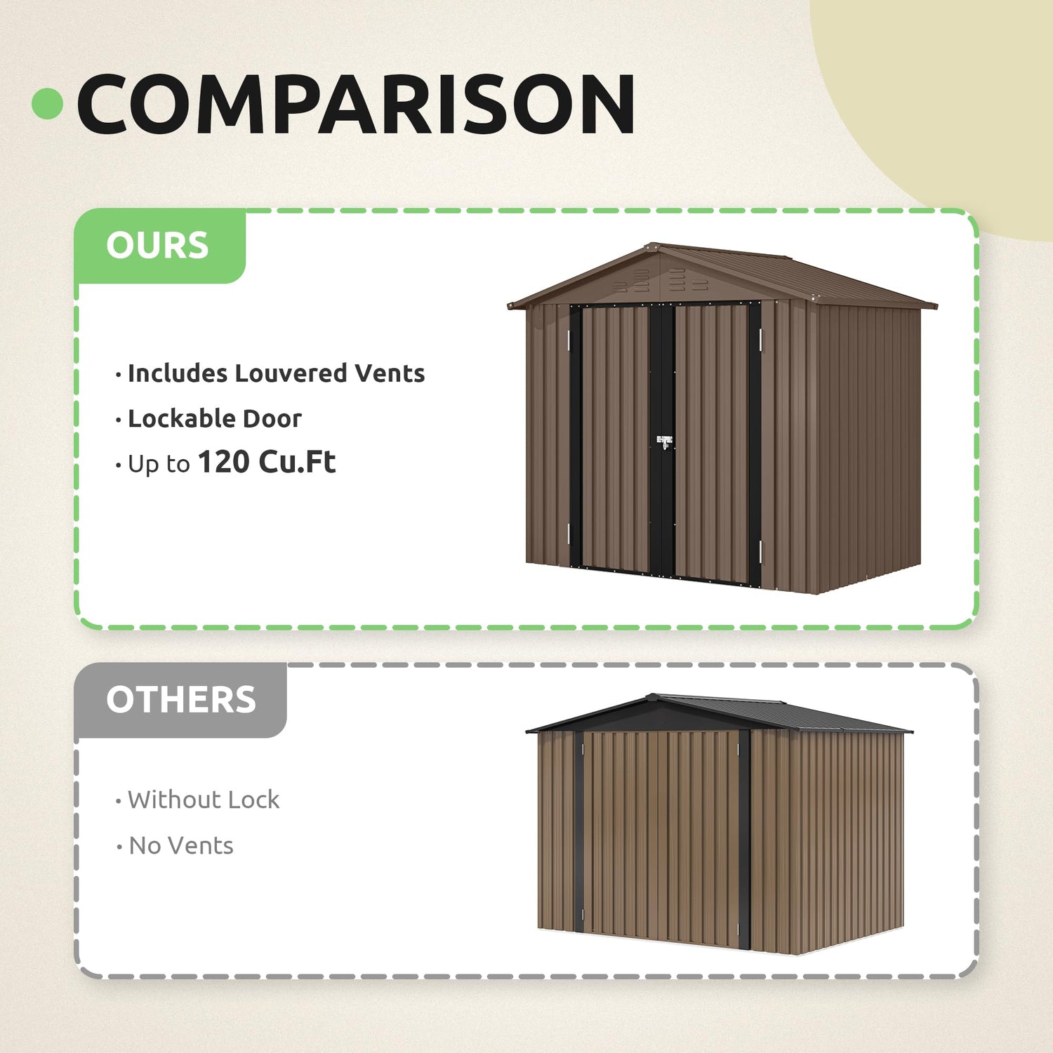 - Effortless Access & Secure Storage: Step into your outdoor storage shed with ease, thanks to the tall 61.4'' hinged door that makes entry and exit more comfortable, even with bulky tools in hand; Lock up your belongings when you're away for extra peace of mind
