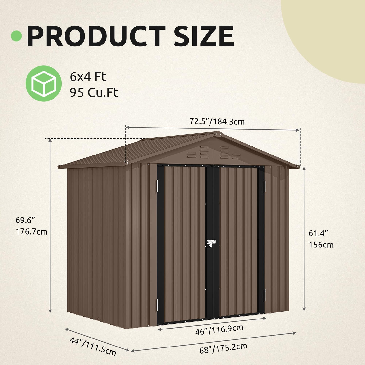 - Roomy & Ready for Anything: With overall dimensions of 72.5''L x 447''W x 69.6''H, and a door opening of 46''W x 61.4''H, this tool shed easily houses lawn mowers, bikes, snow blowers, BBQ grills, or even extra patio furniture, all in one tidy place