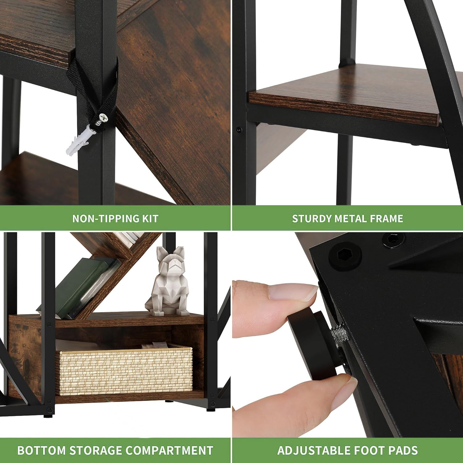 - Minimalist Oval Look: This three-tier bookcase features a sleek black metal frame and shelves with a rustic brown wood finish, elegantly shaped in an oval silhouette. The central shelves are ideal for books, while the smaller left and right shelves perfectly showcase decorative objects