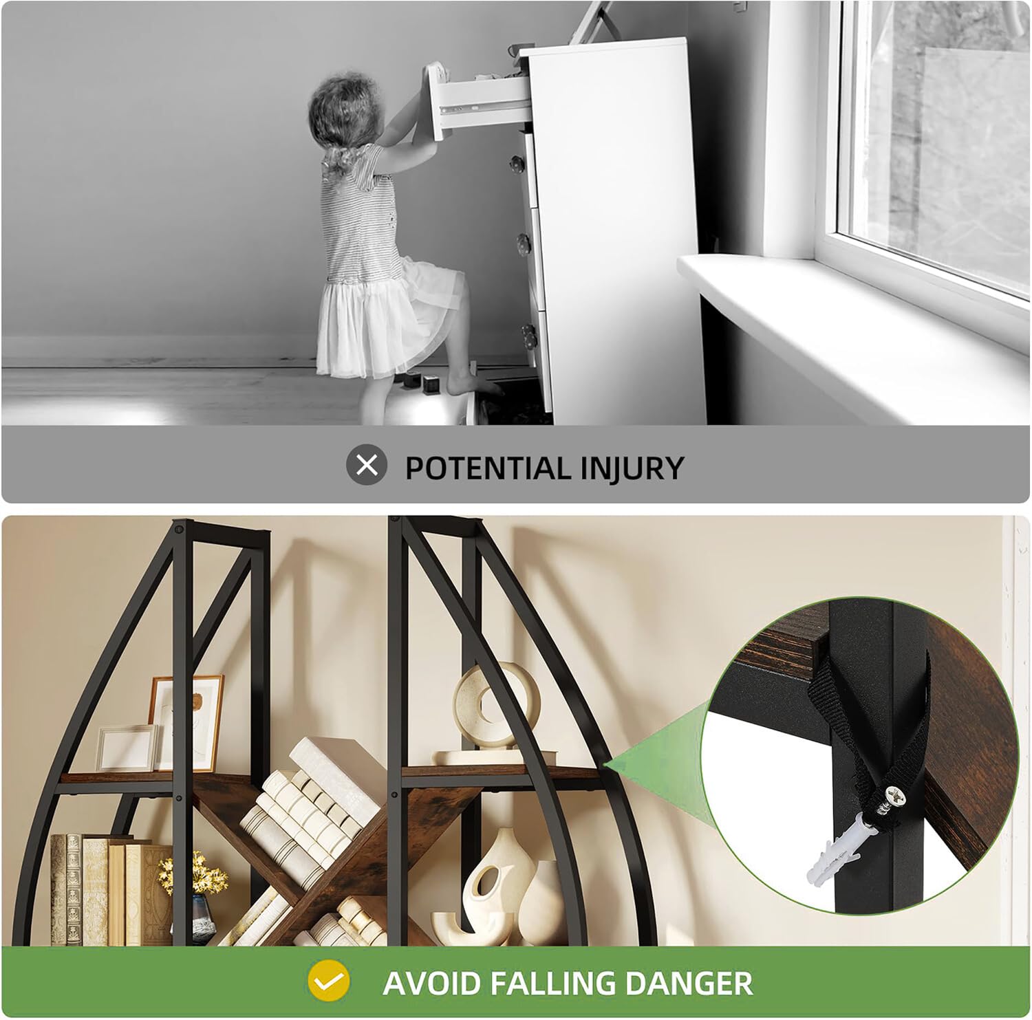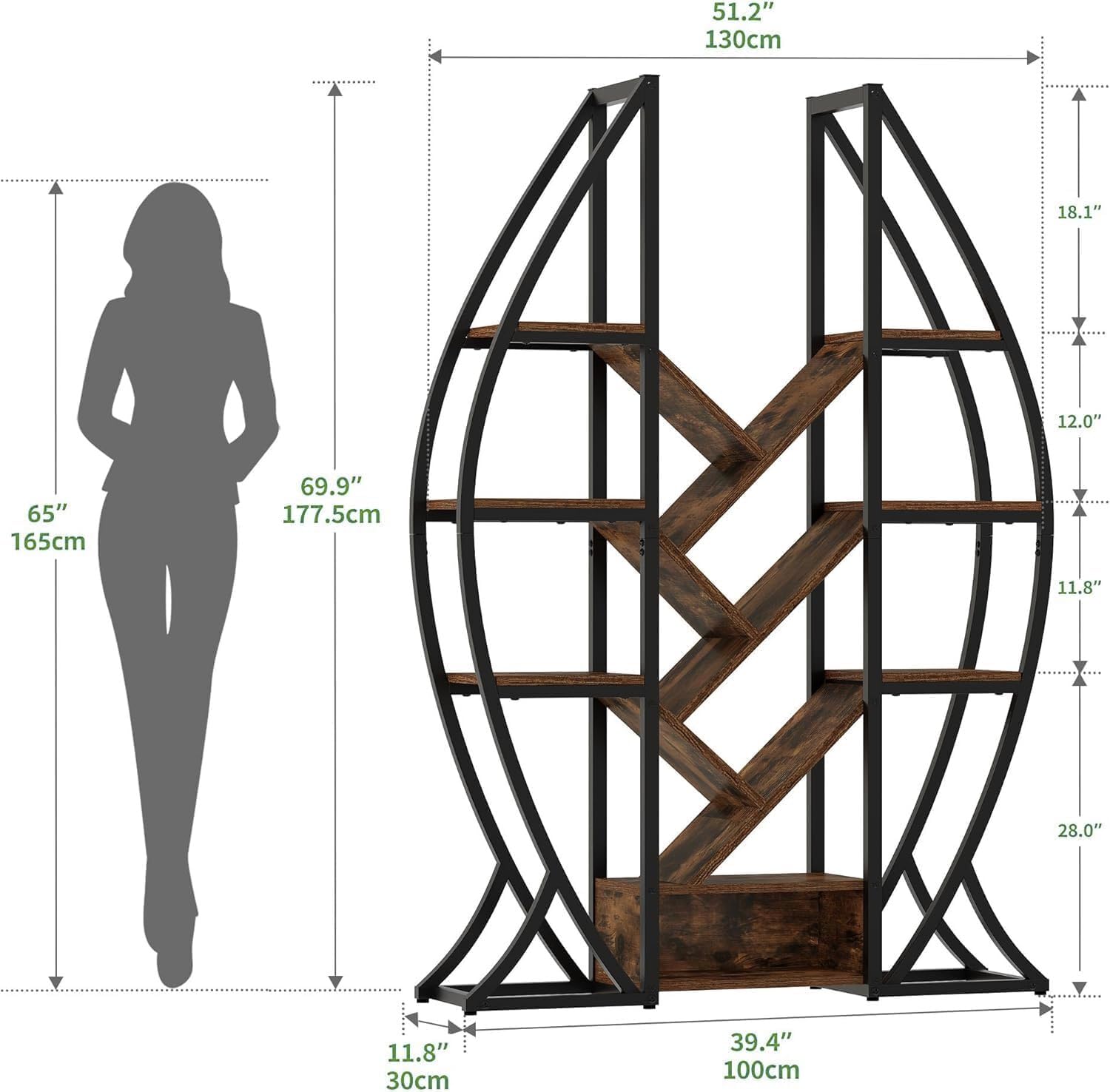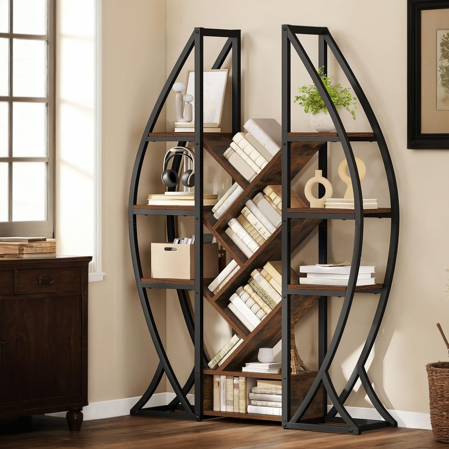 GOOBED Oval Bookshelf, Triple Wide 5 Tier Etagere Bookcase, Industrial Display Shelves Tree Bookshelf for Living Room, Bedroom, Home Office, Rustic Brown