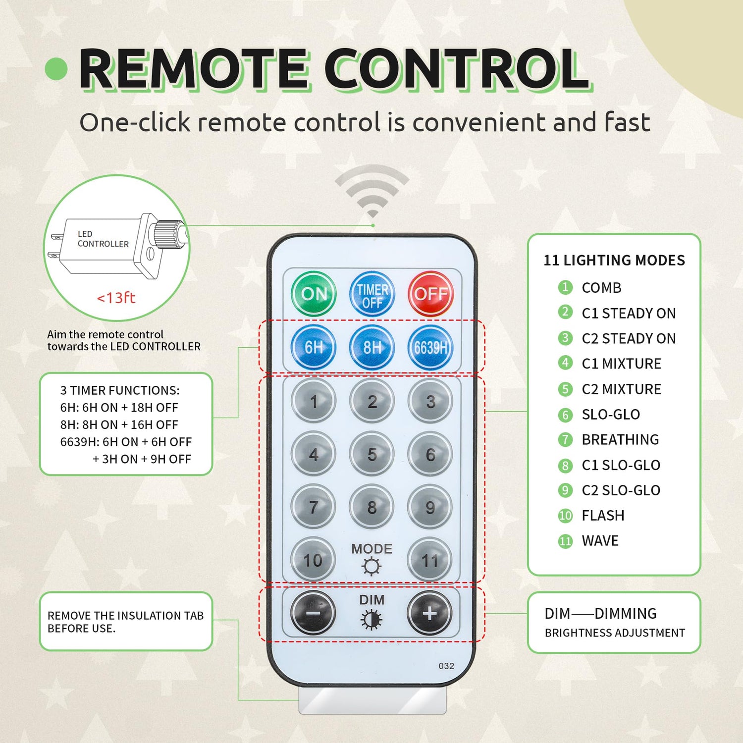 - Built-in Lighting System with Remote Control: Set the ideal holiday mood with 500 dazzling lights in warm white or multicolor. Easily switch between warm white and multicolor lights, adjust brightness levels, and choose from 3 timer settings using the included remote; Choose from 11 magical light modes, all easily controlled by a remote from up to 13 ft away, just point it at the string light switch