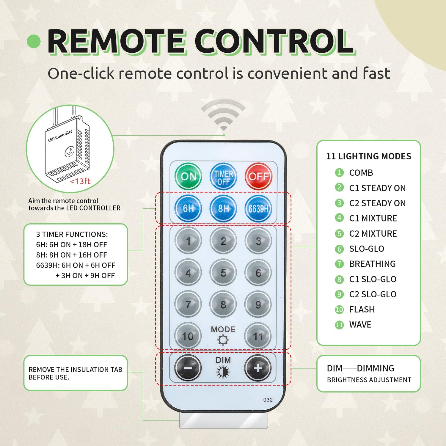 - Control Upgrade with Remote: Easily manage your tree’s lights, modes, and brightness with the included remote control. Simply aim it at the lights’ switch for seamless operation from up to 13 feet away, giving you full control without needing to get close.
