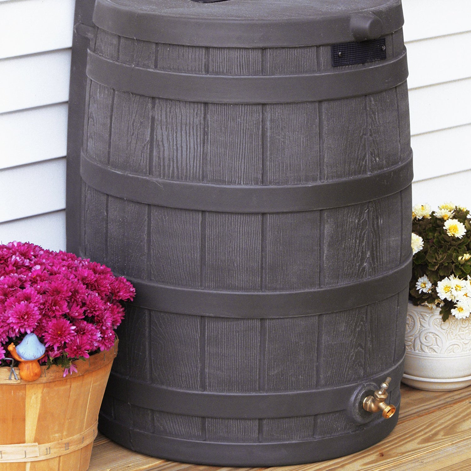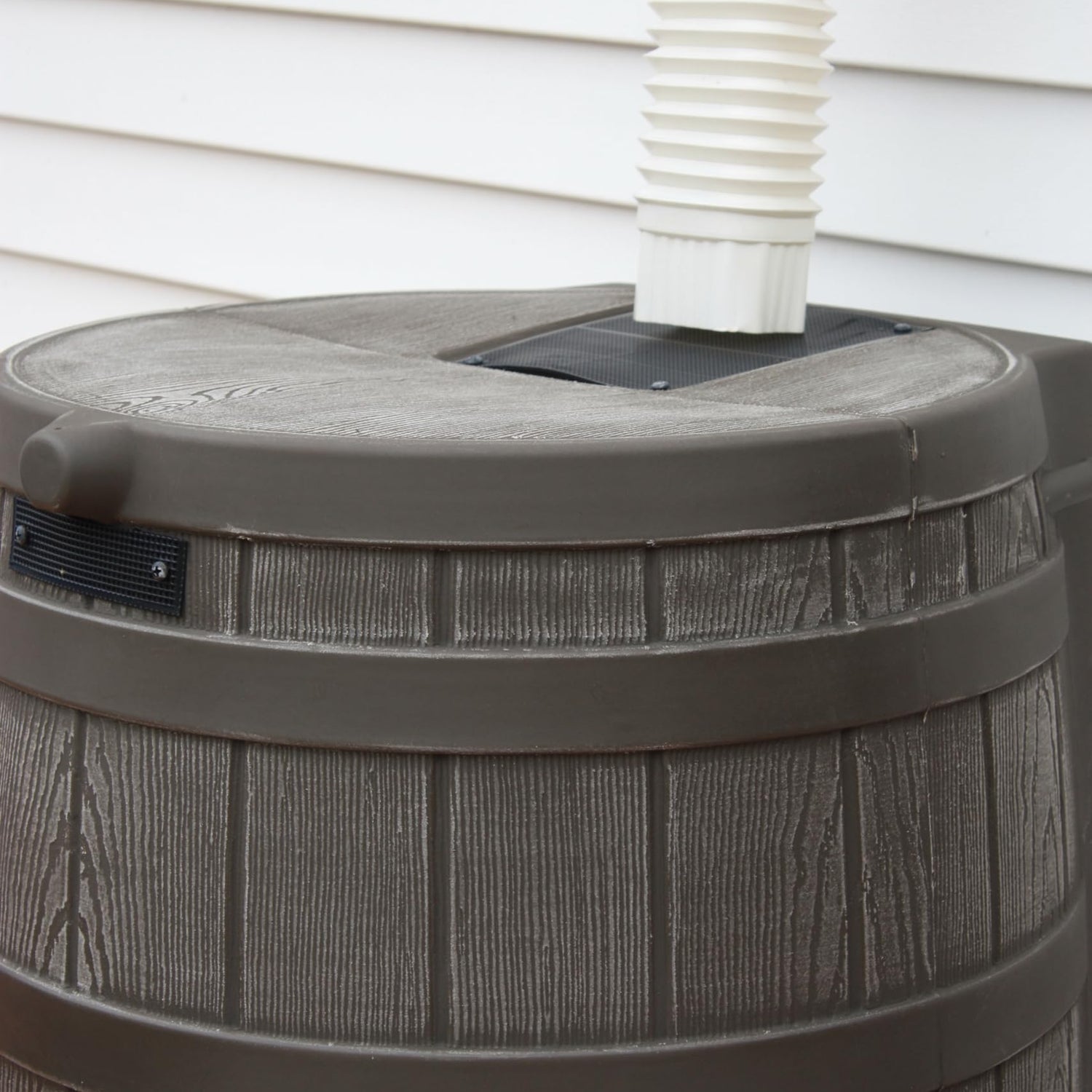 - Ensure a backup water supply for your home and garden using these faux wood rain barrels to collect rainwater from the gutter.