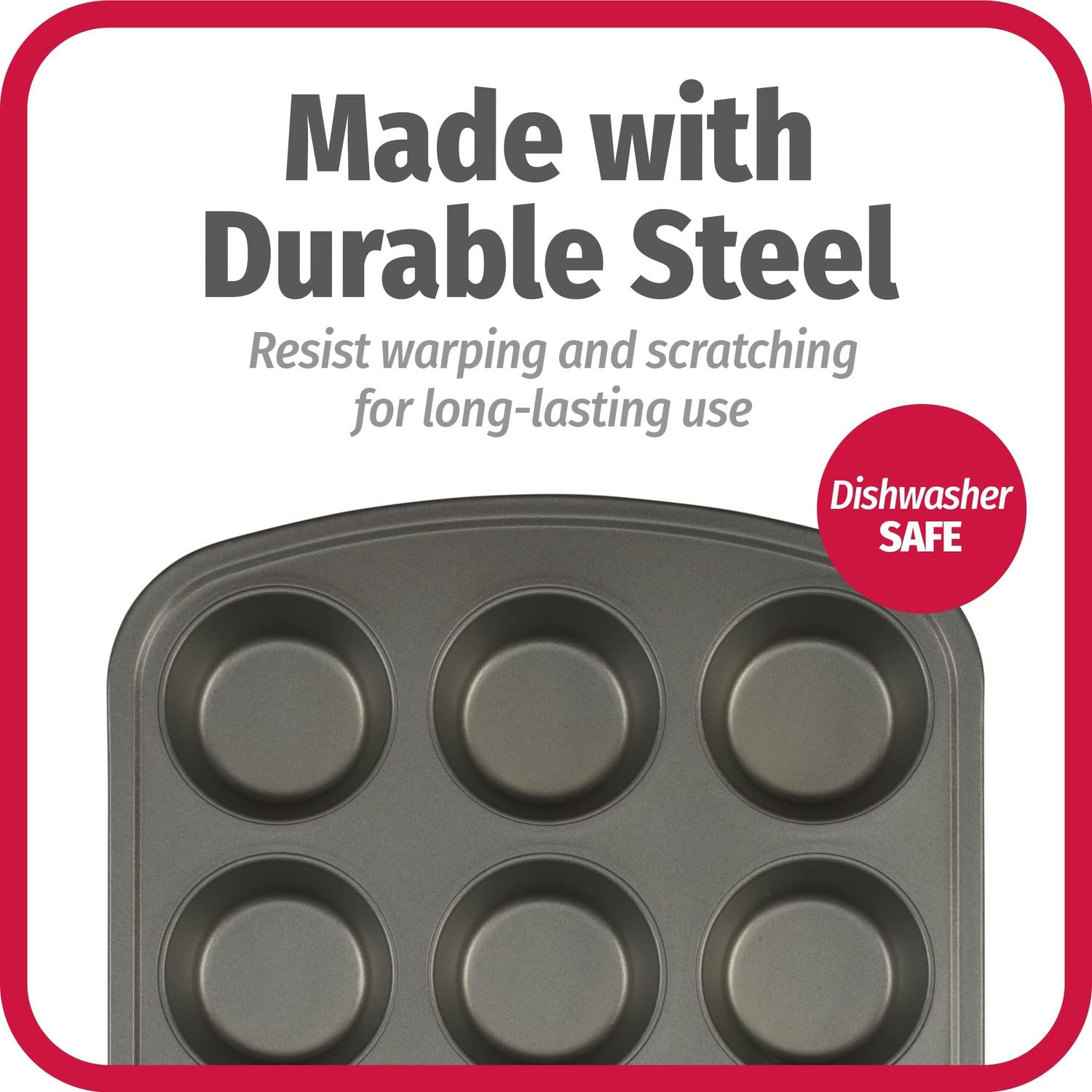 Details: This pan has twelve 2 3/4 inch wells, so you can bake a dozen cupcakes at a time with cupcake papers for a party presentation, or bake right in the wells if you prefer. The pan has a superior nonstick coating for easy removal of baked goods, no matter what you're baking. Cleaning is easy by hand since food wipes off easily with no scrubbing, but the pan is also dishwasher safe. Made from heavy gauge steel, the pan distributes heat evenly for perfect browning while it resists warping. When dessert or muffins aren't on the menu, they can also be used for savory snacks like single serve quiches or mac and cheese bites. A wider lip on two sides makes the pan easier to hold, so it's easier to get in and out of the oven, even with oven mitts. This product contains: 2-butoxyethanol, Aluminum, Chromium, Copper, ethylbenzene, Manganese, Nickel, octamethylcyclotetrasiloxane, Phosphorus, xylene,