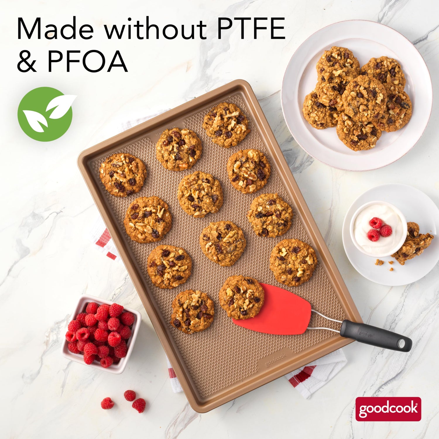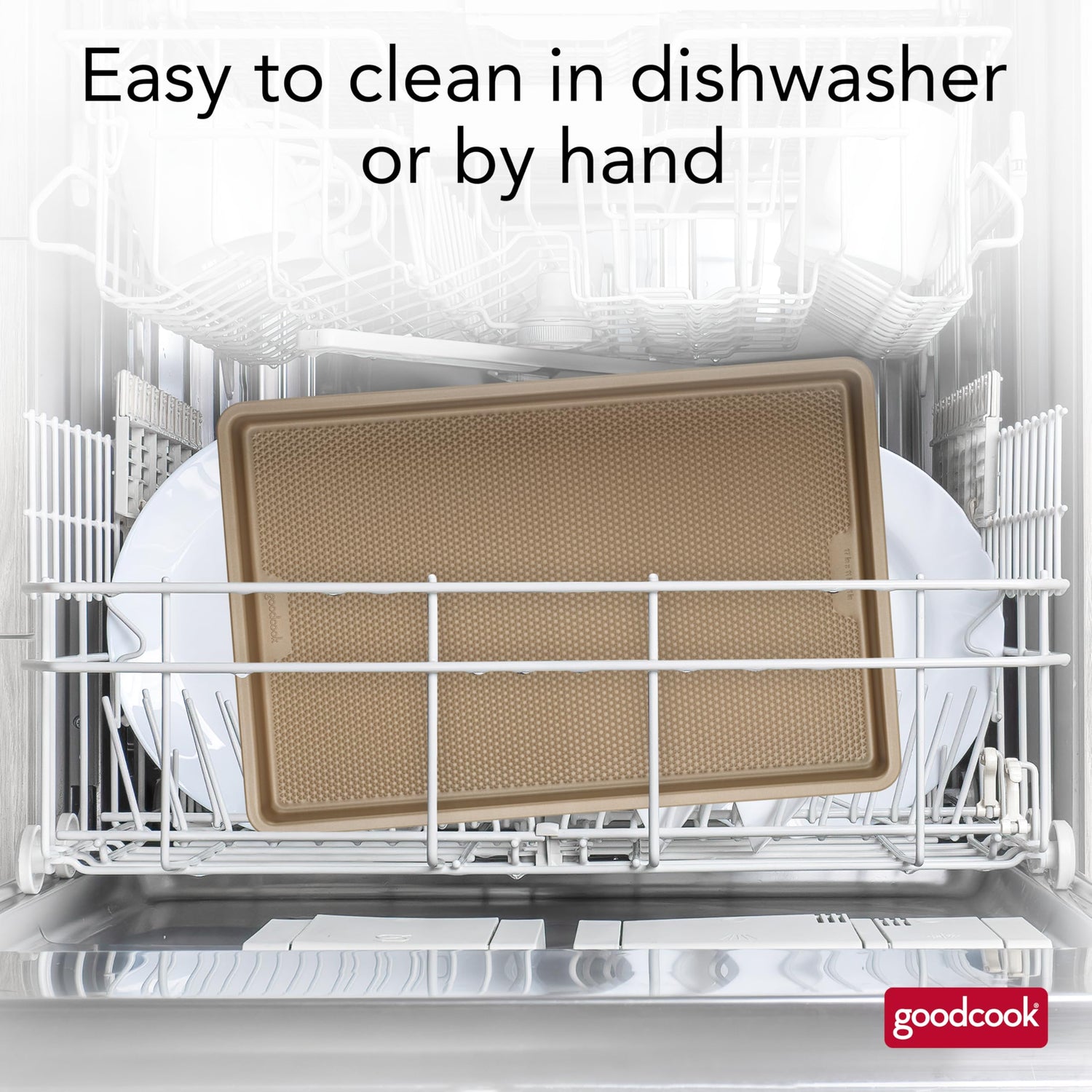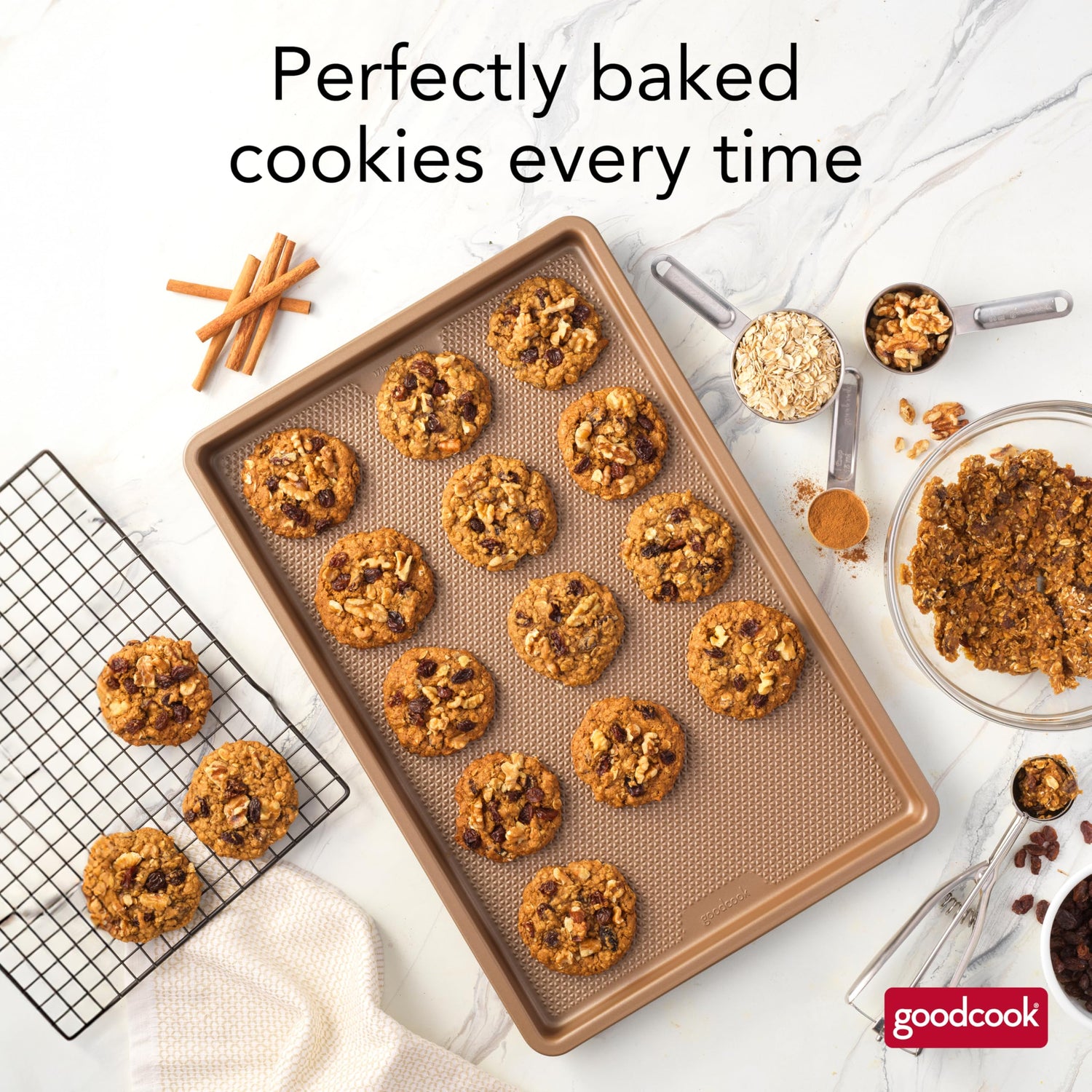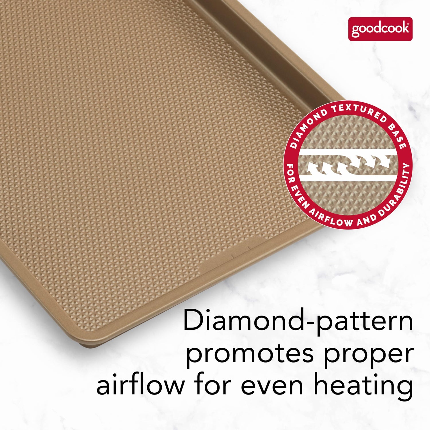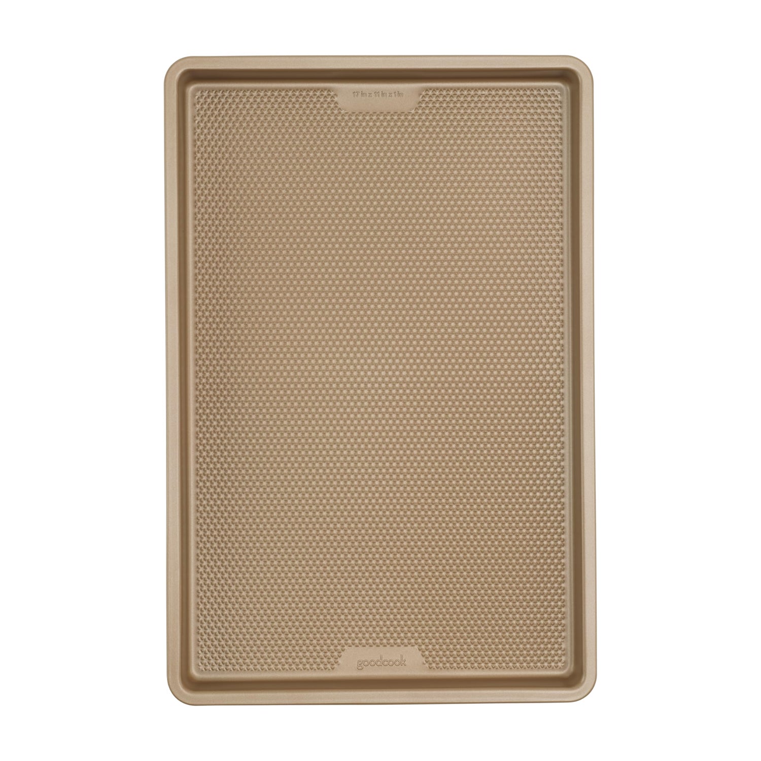 Details: Bring quality bakeware to your home kitchen with the GoodCook BestBake Textured Large Cookie Sheet. This premium baking sheet ensures a perfect bake every time for larger batches of your favorite recipes, from cookies and other desserts to sheet pan dinners. The textured, diamond-pattern surface finish promotes proper airflow for even heating without hotspots and offers additional stability and strength. Scratch-resistant nonstick coating, provides excellent release while also making clean up quick and easy. The bakery-style side walls designed at a 4 to 5 degree angle keep items on the sheet and create straighter edges for professional-looking baked goods. This nonstick baking sheet measures 17" x 11" x 1" and is made with carbon steel and bronze finish to resist warping and offer high quality baking for years to come.