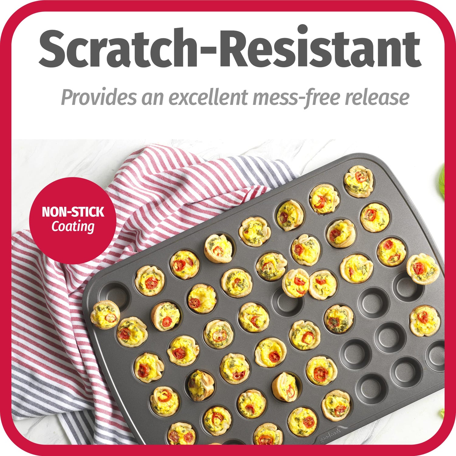 - 48-CUP MINI MUFFIN PAN: Upgrade your kitchen with this GoodCook Muffin Pan for your favorite bite-sized muffin and cupcake recipes. The 1-7/8-inch diameter cups create a perfect shape for delicious and professional looking baked goods.