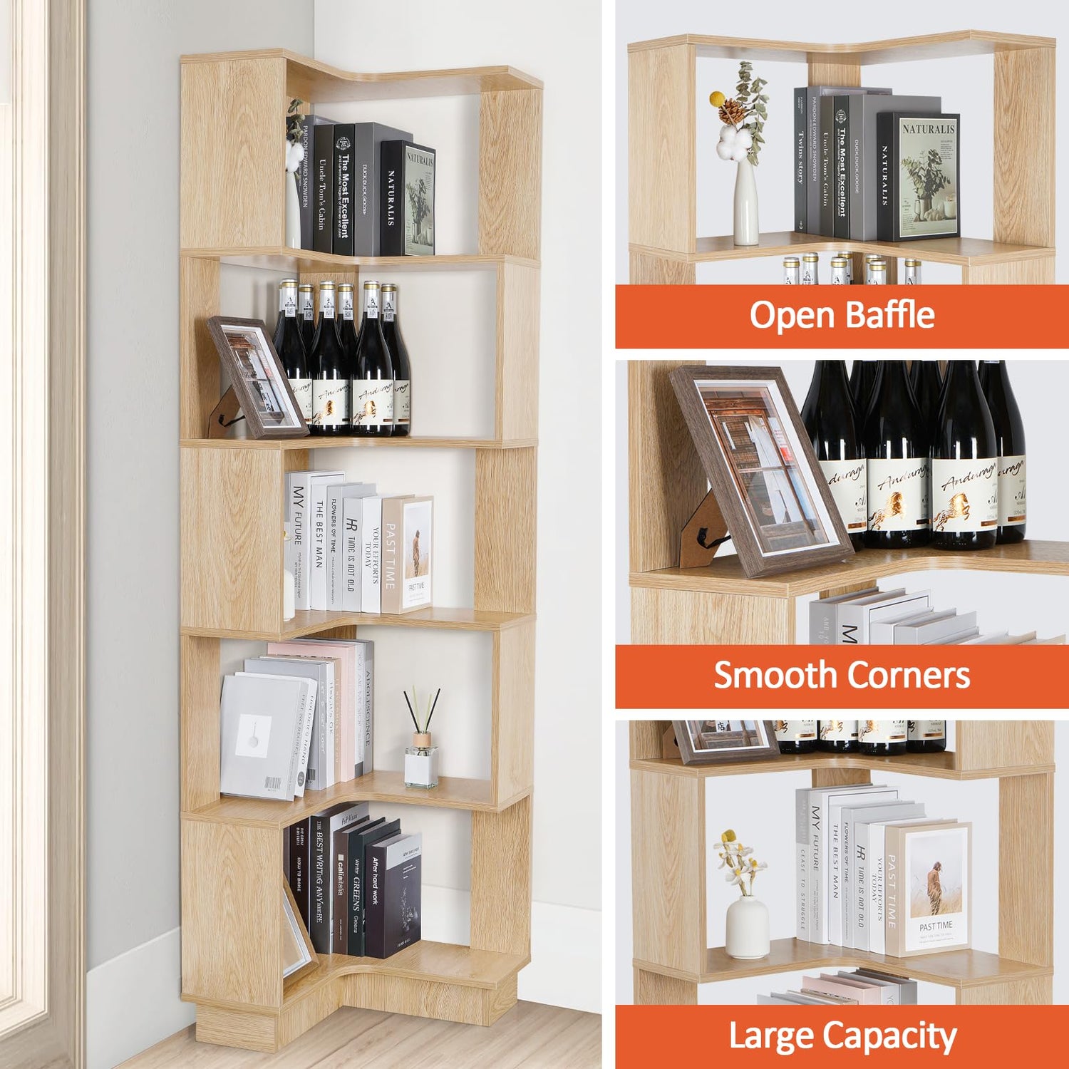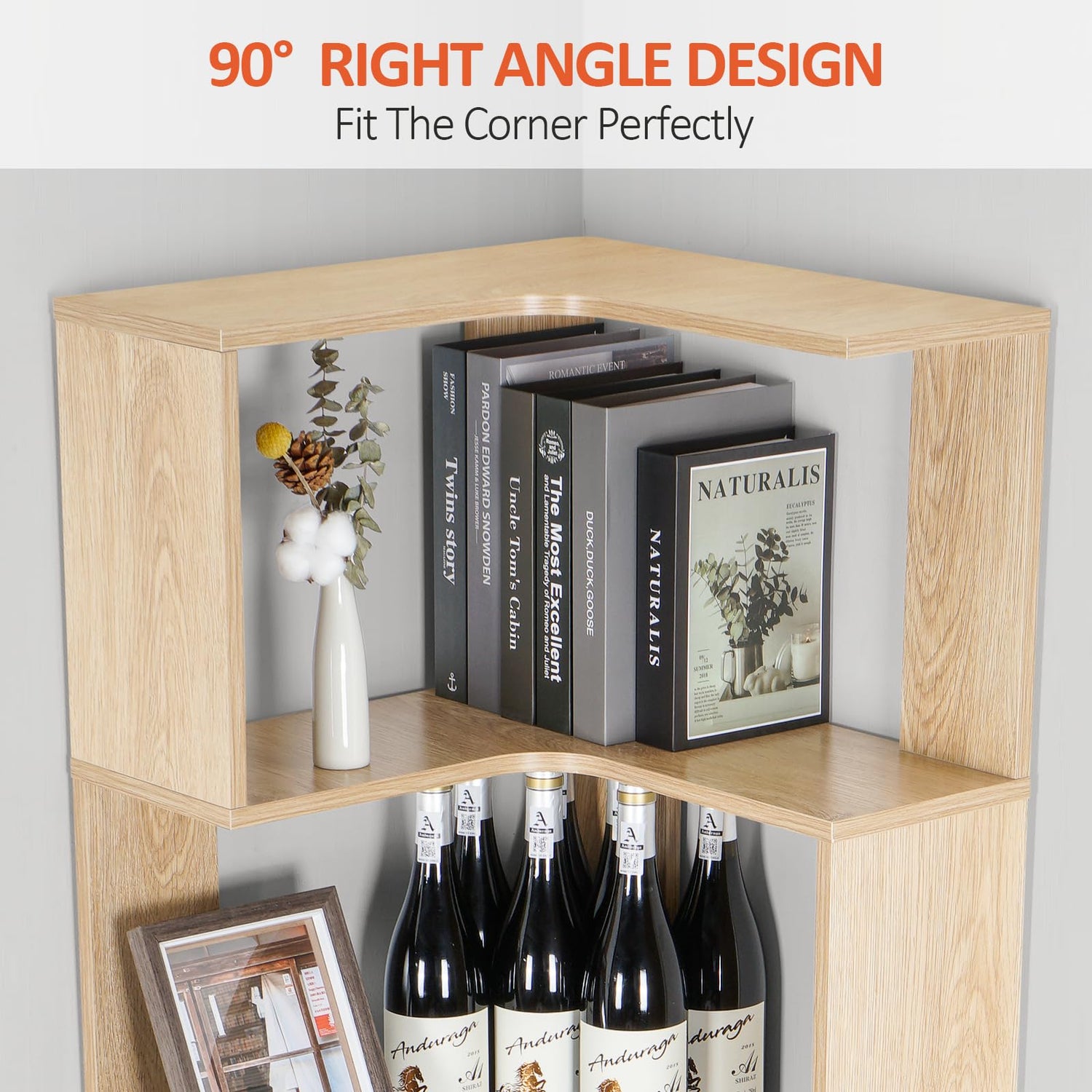 - Easy to Assemble : With the instructions included in the package, I believe you will be able to complete the installation of the corner bookshelf in no time. In addition, in order to further improve the stability of the bookshelf, the designer added two additional upper and lower fixing devices