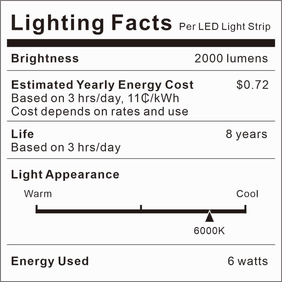 - ✅【 LIGHTING FACTS】The brightness is 2000 lumens. The estimated yearly energy cost is only $0.72 based on 3hrs/day and 11 cents / kWh. The life span is 8 years. The light appearance is 6000K. And the energy used is only 6 watts.
