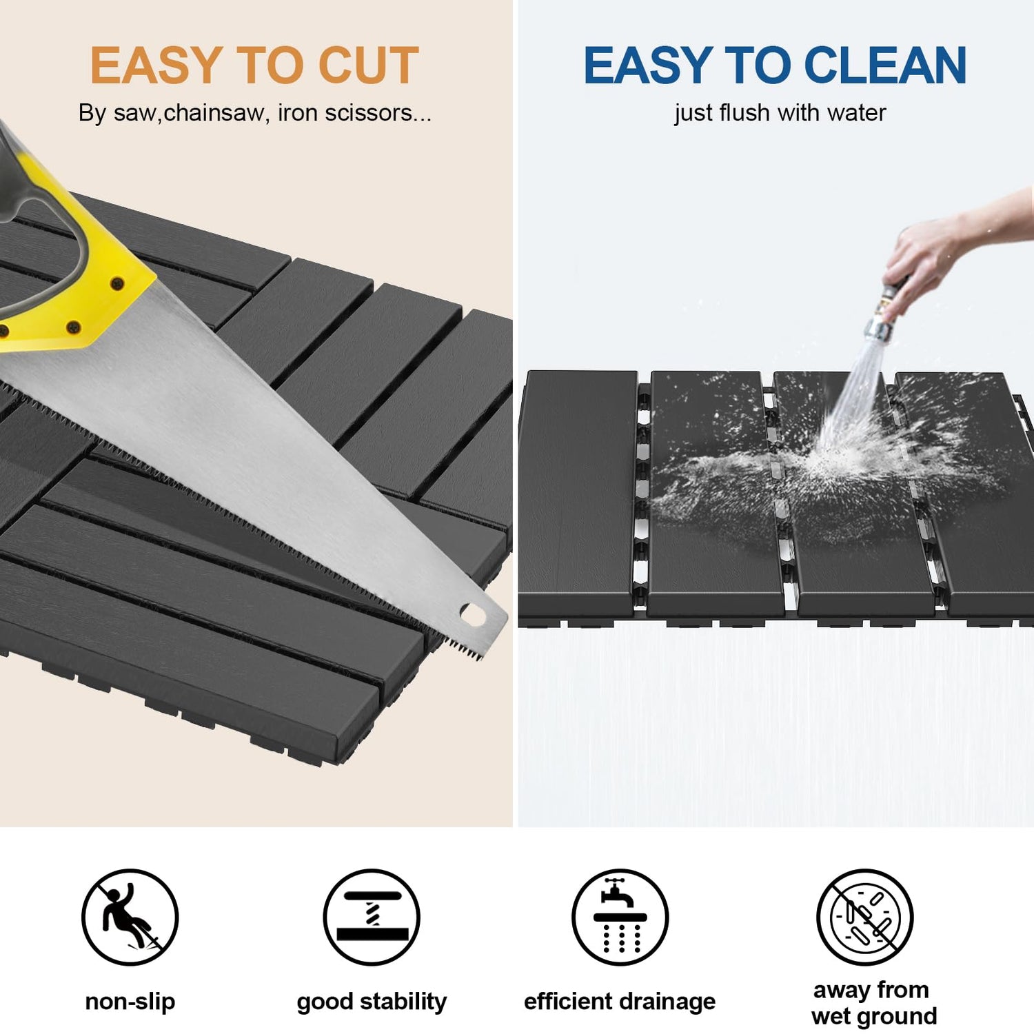 - 【Customizable & Wide Usage】Use a saw or other cutting tool to cut the plastic floors to the size you want. Fitting for putting this balcony deck tile in your patio deck, pools, garden, soft lawn, backyard, porch, outdoor playground, walkway and the other outside places. Or using in your bathroom, living room and the other indoor areas.