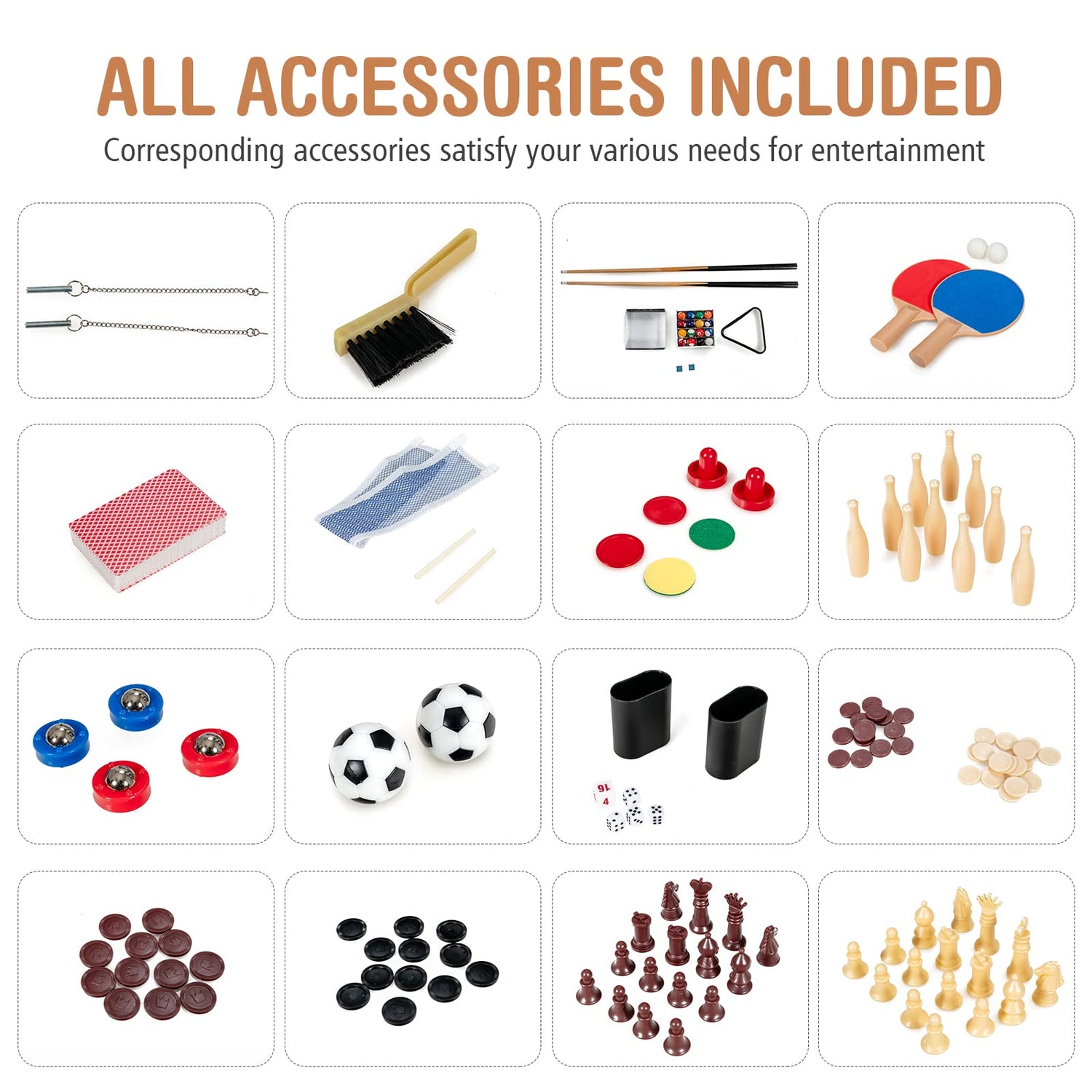 - đăVersatile 10-in-1 Designă This multi-game table possesses 6 ball games, including foosball, bowling, table tennis, hockey, billiard and shuffleboard, and 4 board games, including checker, poker, chess and backgammon. Additionally, the stack-up tabletop design allows you to quickly switch the games without efforts.