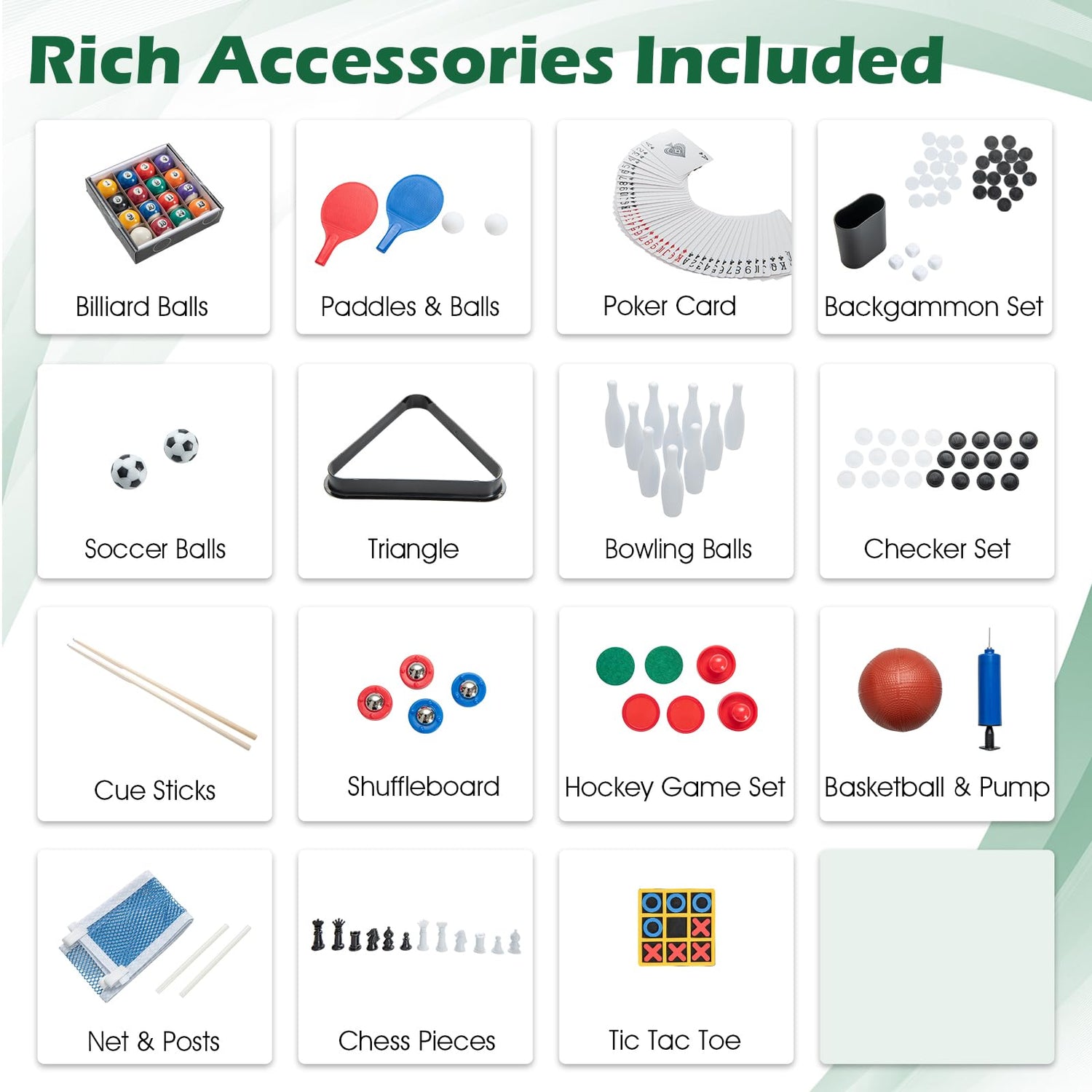 - 🎁【14 in 1 Game Table Set】 Featuring 7 exciting ball games, 5 board games and 2 toss games including foosball, hockey, billiards, table tennis, bowling, shuffleboard, chess, backgammon, checkers, poker & dice, ring toss, horseshoes, basketball, and tic tac toe. This 14 in 1 game table set will surely offer you endless fun.