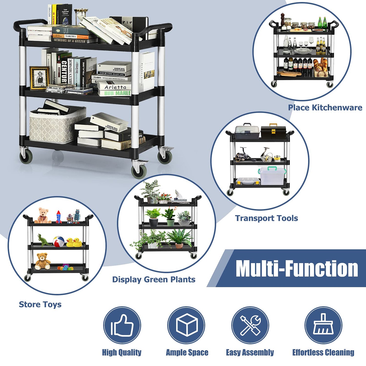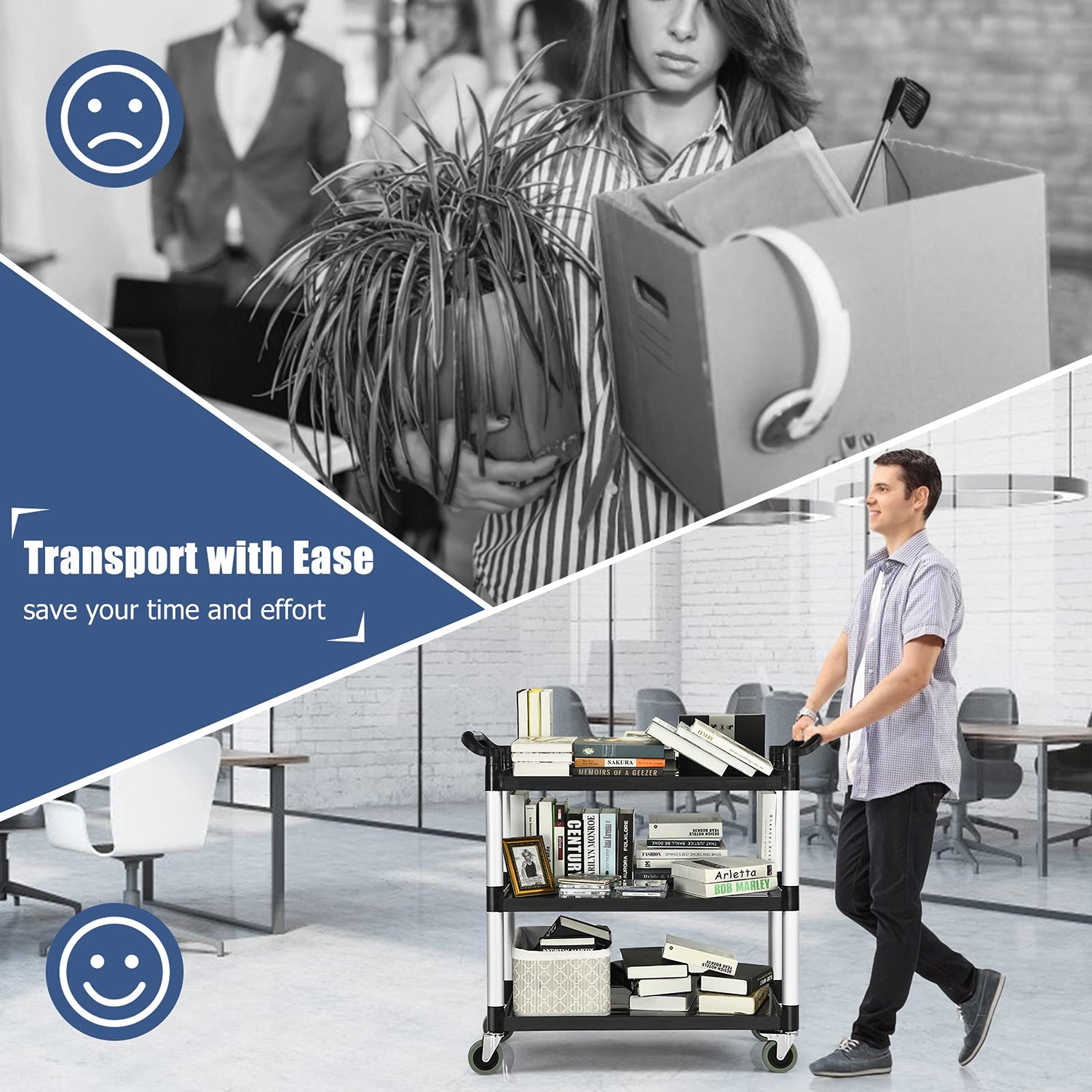 - Dual Handles for Easy Control: Designed with double ergonomic handles, this service cart offers precise steering and easy handling for navigating through any spaces in offices, garages, or bustling kitchens.