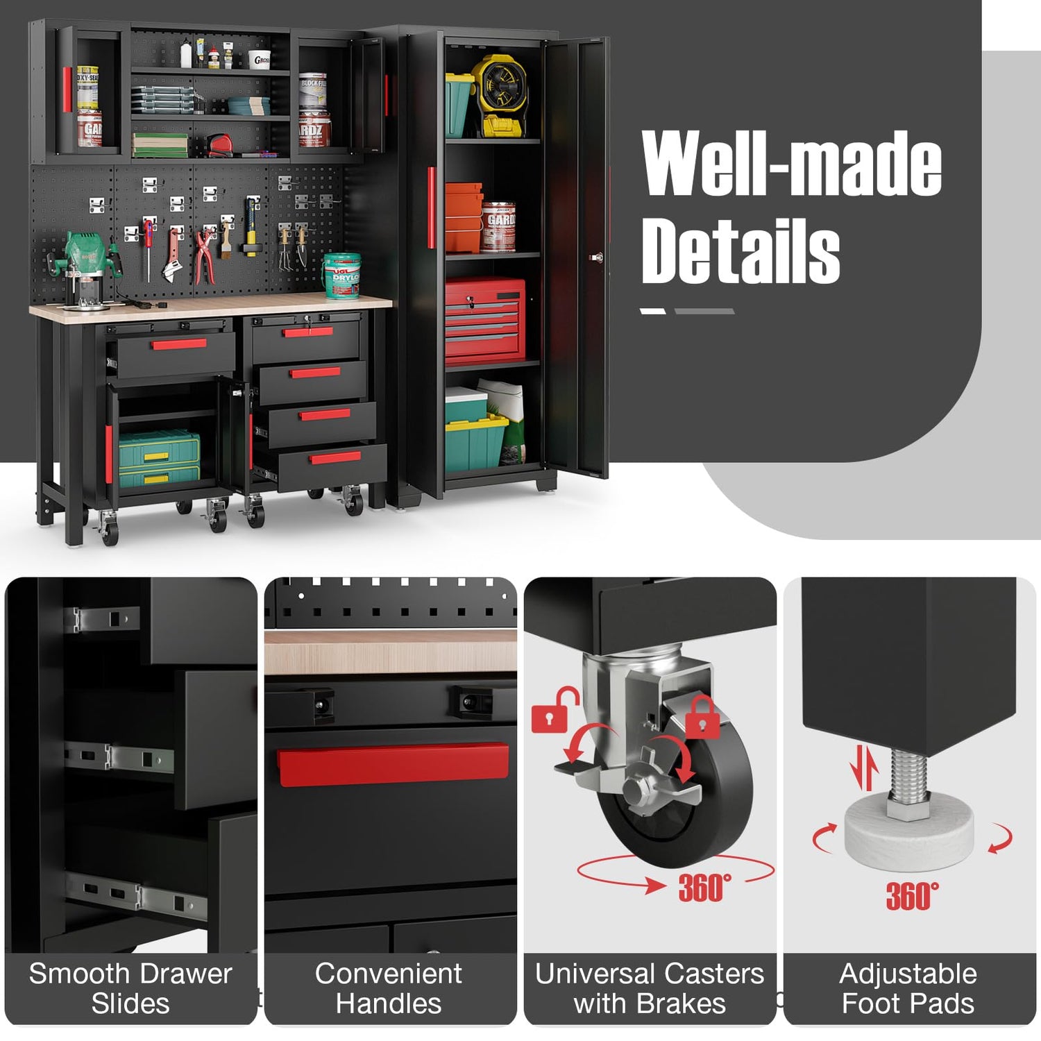 This comprehensive garage storage cabinet set includes a durable rubber wood worktop for hands-on tasks, wall cabinets for organized storage and an adaptable pegboard system for easily accessible tools. The 2-door and 4-drawer rolling tool chests ease your workflow. Additionally, the spacious tall locker with adjustable shelves securely holds larger items. The garage cabinet set's sturdy metal frame supports a maximum load of 2420 lbs, ensuring strong and reliable support.