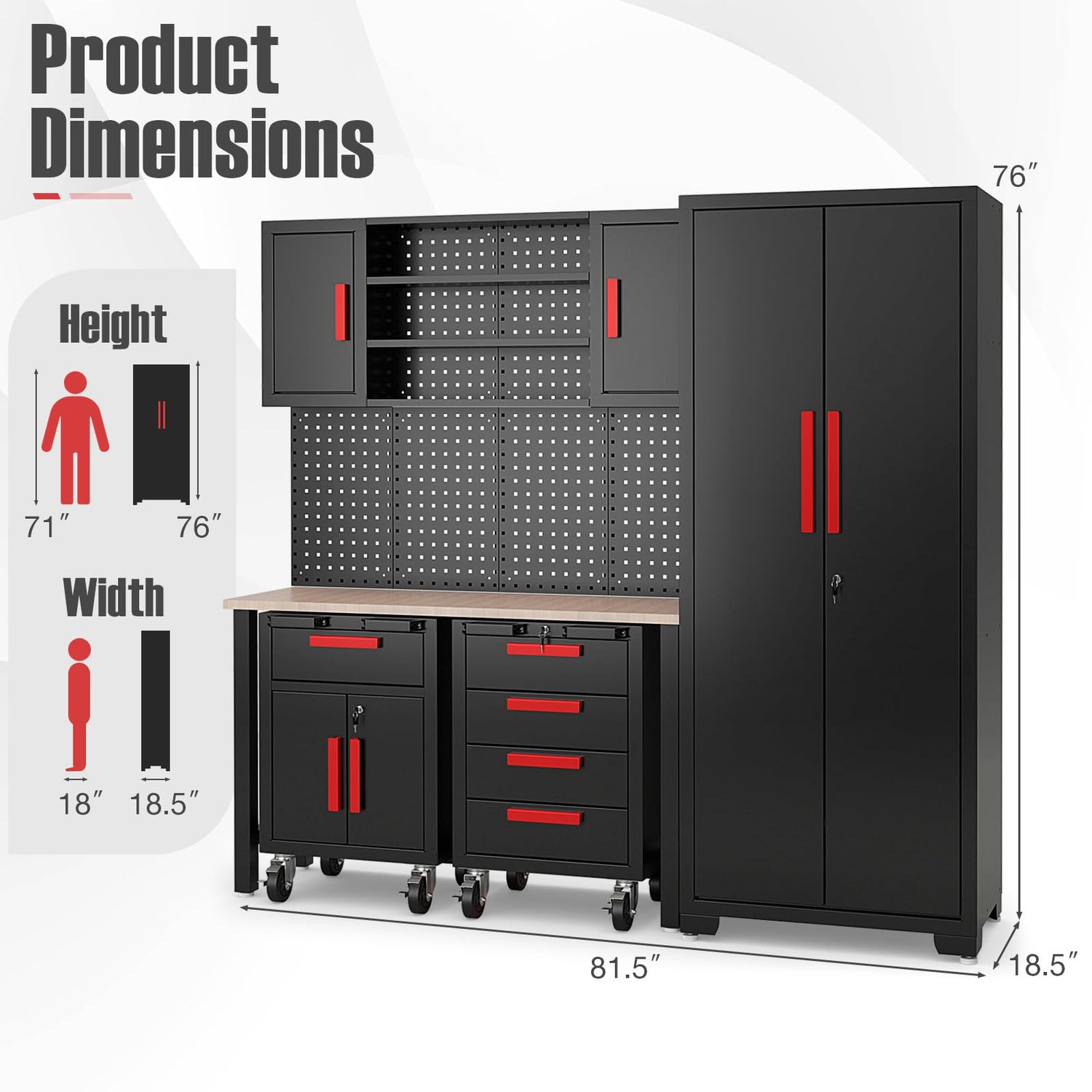 - 【6-piece Garage Storage System】This garage cabinet set includes a wall cabinet, tall storage cabinet, workbench, 2-door rolling tool chest, 4-drawer rolling tool chest and 6 pegboards. All of them are constructed of sturdy metal to load up to 2420 lbs, meeting your different storage needs.