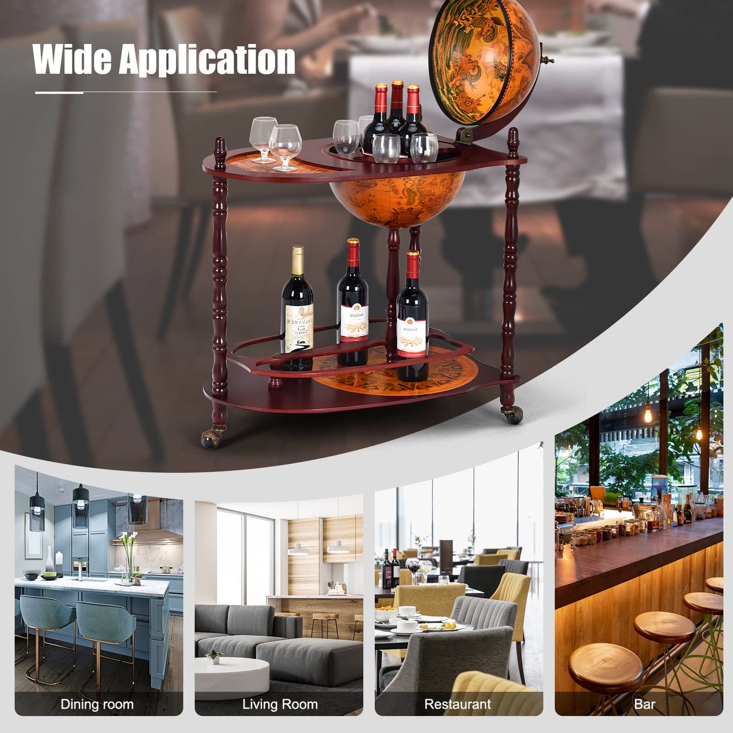 - 🍷【Globe Bar Cart with Wheels】The wood wine cabinet is equipped with 360° smooth-rolling wheels so as to allow it for free mobility when you want to move globe bar cart from kitchen to dining room. Whether for home use or commercial use, this liquor cabinet will undoubtedly be an ideal addition.