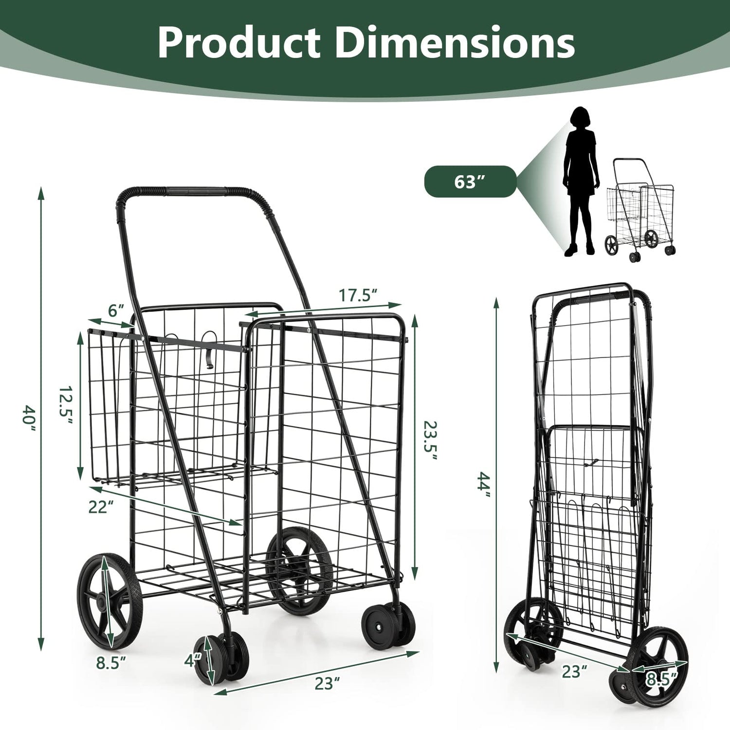 Goplus Jumbo Folding Shopping Cart with Rolling Swivel Wheels, Foldable Grocery Cart on Wheels with Double Basket, Heavy Duty Utility Cart, Shopping Carts for Groceries Laundry Book Luggage Travel