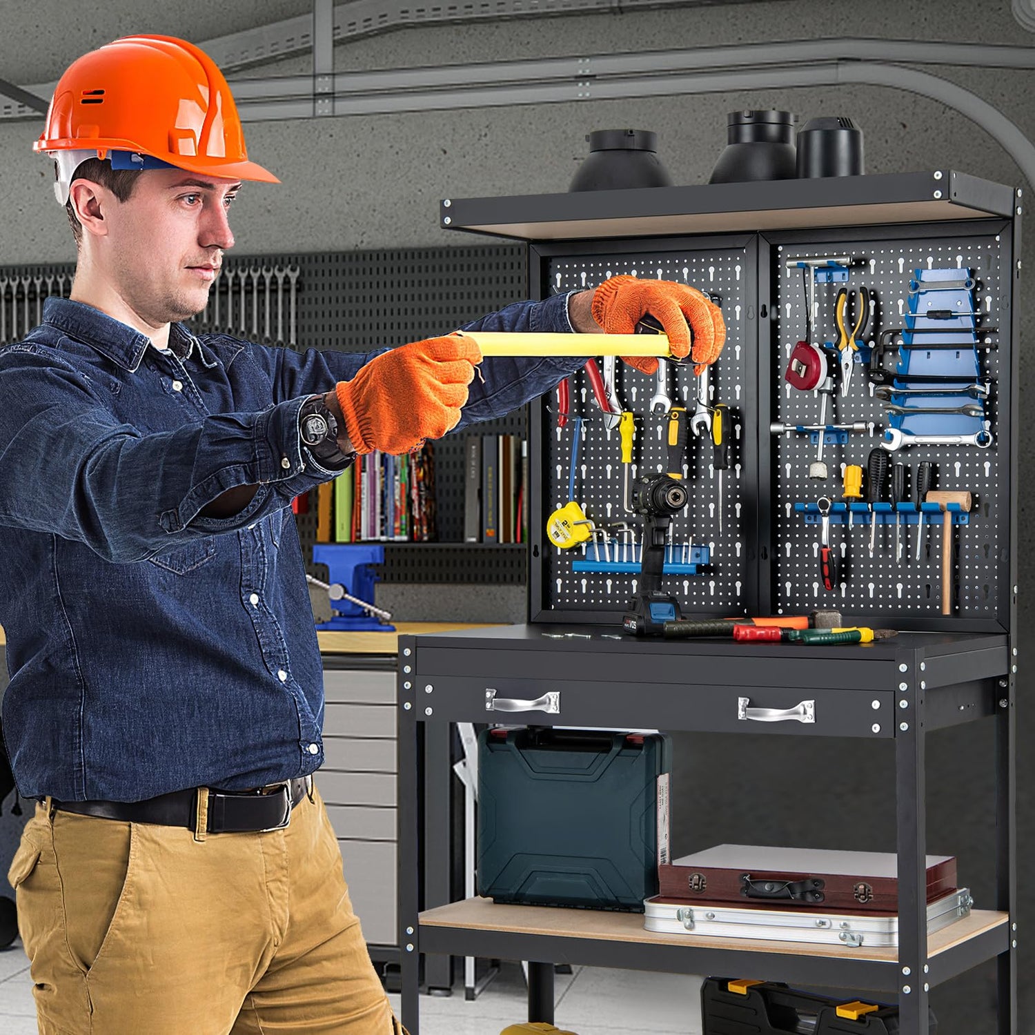Goplus Workbench with Pegboard, 32" x 16" Multi-use Workbench with 2 Tires of Shelves, Topping Space, Drawer, Robust Metal Frame, Heavy-Duty Work Table Tool Storage Bench for Workshop Garage