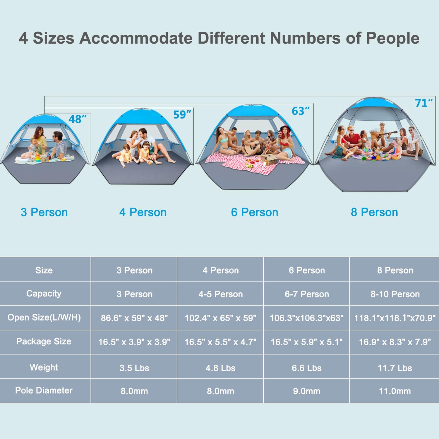 - Super Large Space: Size of 86.6"L x 59"W x 48"H, 30% bigger than other beach tents at similar price, fits 3 person. It provides a comfortable space for family and friends on the beach