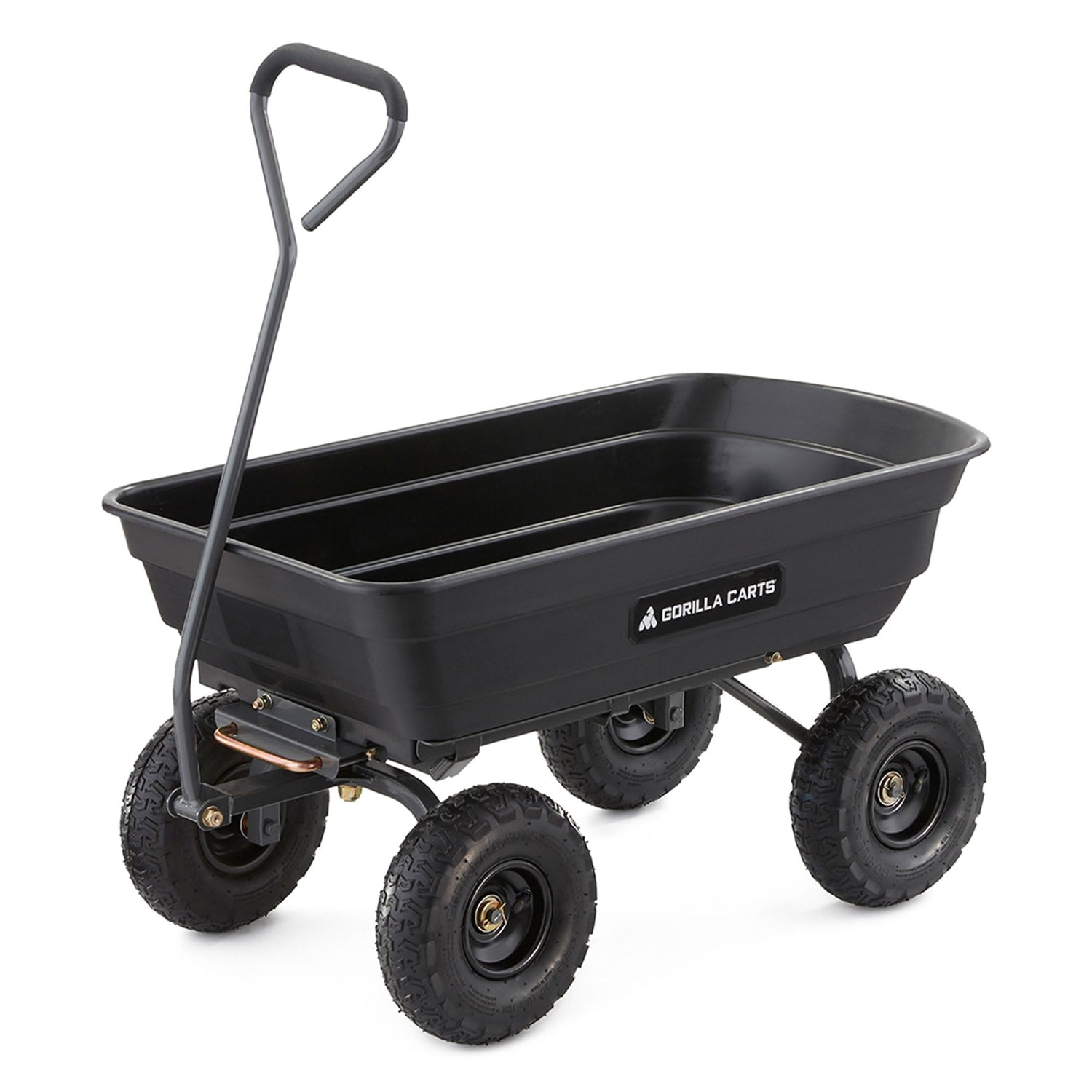 Details: The newly-designed Gorilla Carts 600-lb. Capacity Poly Garden Dump Cart has an innovative, updated frame design that makes it quick and easy to assemble and put this cart to work. The cart features the patented quick-release dumping system, which allows the cart to be loaded and unloaded with ease, and the balanced 4-wheel design makes it a simple-to-use alternative to a wheelbarrow. The new frame design allows for easy assembly, while improving maneuverability and rigidity, increasing ground clearance, and giving the cart a tight turning radius. The durable poly bed is maintenance-free and easy to clean, and the 10 in. pneumatic tires are designed to handle any terrain whether you’re hauling heavy dirt, mulch, gravel, or plants. With a 600 lb. hauling capacity and padded dipped-grip handle, this cart is perfect for the casual gardener or the lawn professional. The bed dimensions measure 36-inches by 20-inches, and the cart has an overall height of 19.5-inches and weighs 32-pounds. Gorilla Carts full line of products meets the needs of the light-duty homeowner as well as the commercial-duty professional user by offering a wide variety of carts in different sizes and weight capacities. The Gorilla Carts GOR4PS Poly Garden Dump Cart comes with a 1-year limited warranty.