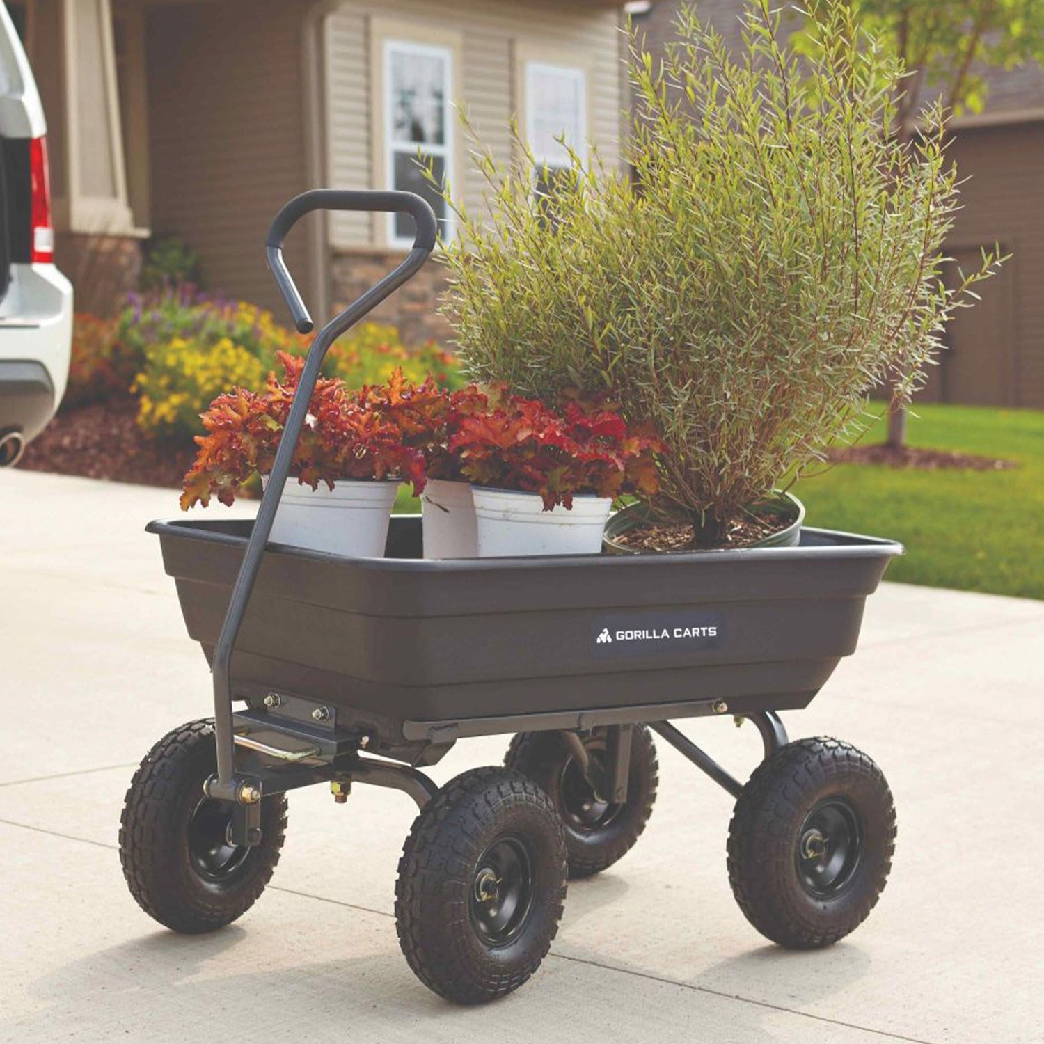 - RELIABLE GORILLA CART: 10-inch pneumatic turf tires with 5/8-inch bore size can haul heavy loads and balanced 4-wheel stability tackles heavy landscaping projects or garden projects