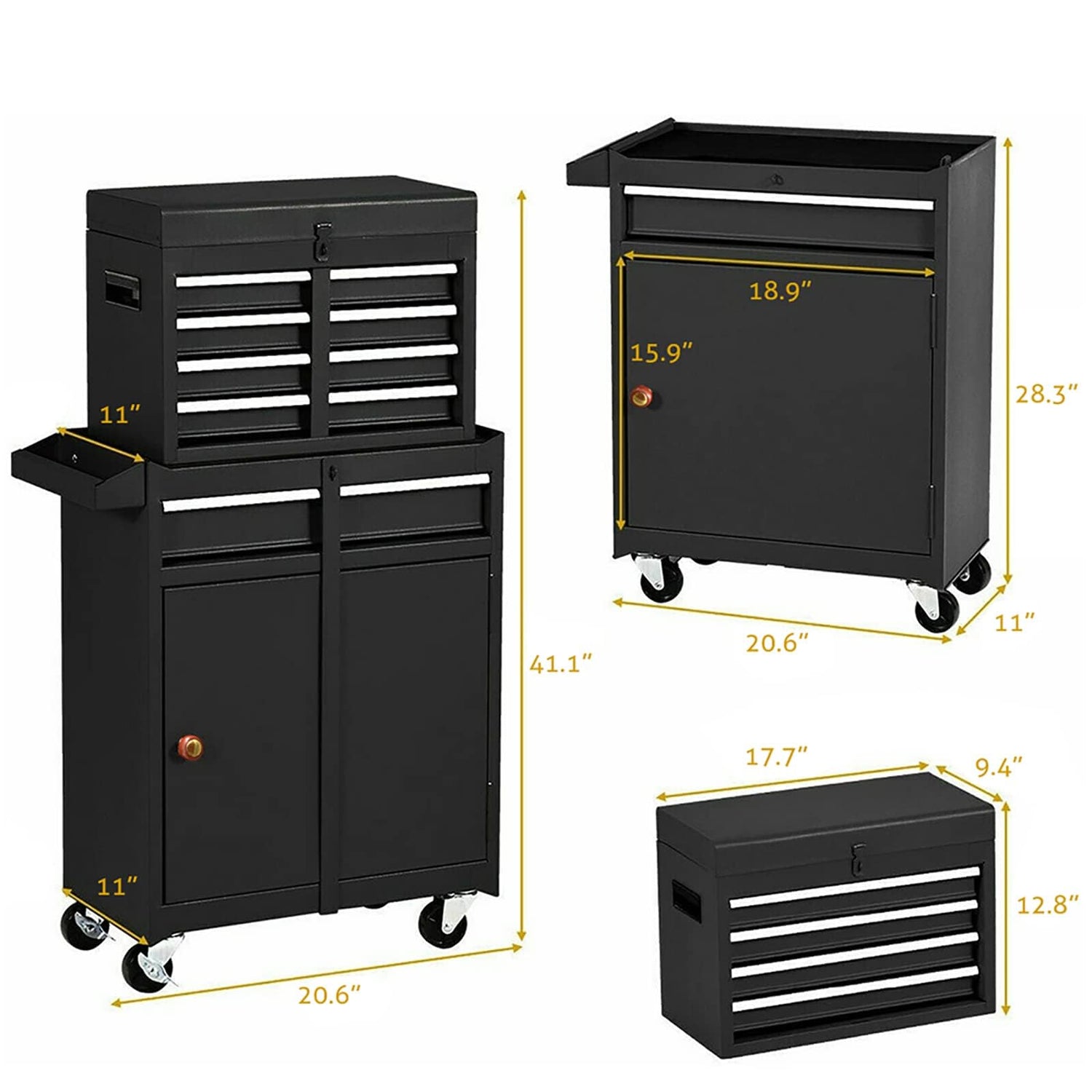 - ✅【Flexible Configuration】Overall Dimension: 20.6" x 11" x 41.1" (L x W x H) Enjoy the freedom to customize your storage setup with our Gornoxblif tool chest. Our Gornoxblif tool cabinet seamlessly transforms into a 4-drawer tool box and a rolling tool cabinet, giving you the flexibility to use them together or separately. Plus, the space-saving feature allows you to store the top tool box inside the bottom tool cart when not in use.