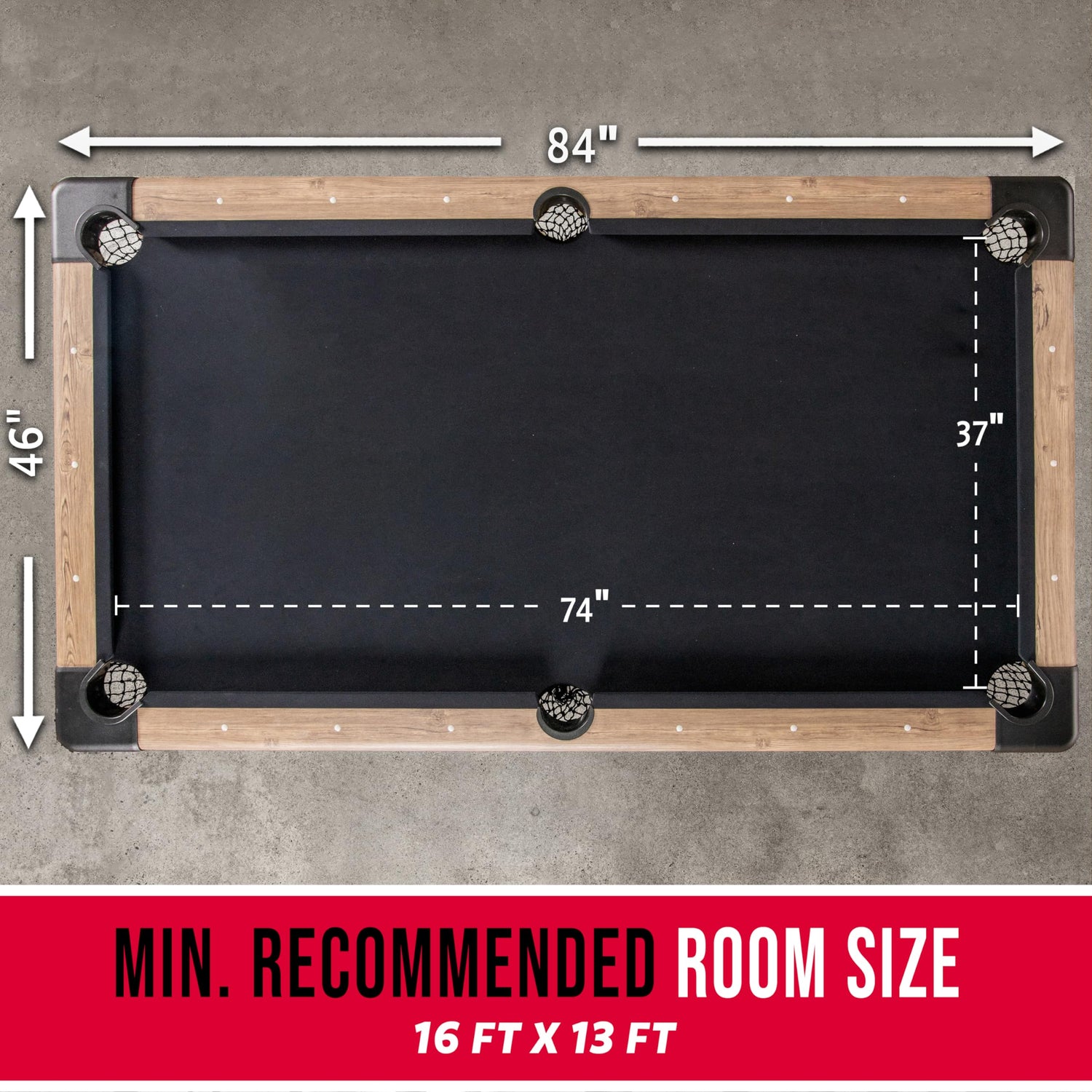 - 7 FT BILLIARDS TABLE: Heavy-duty table measures 84 L x 47 W x 31 H inches; Full set includes 15 regulation balls and cue ball, ball rack, 2 57 inch cue sticks, 2 chalks and felt brush