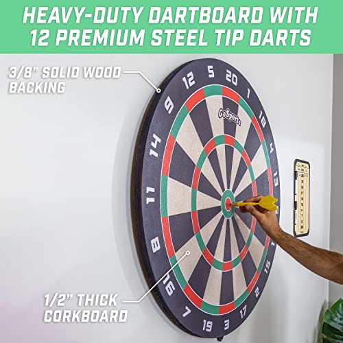 - PREMIUM CONSTRUCTION: Heavy-duty dartboard made from a 1/2 inch thick cork board with 3/8 inch solid wood backing; Includes 12 giant size darts with steel tips and premium steel scoreboard