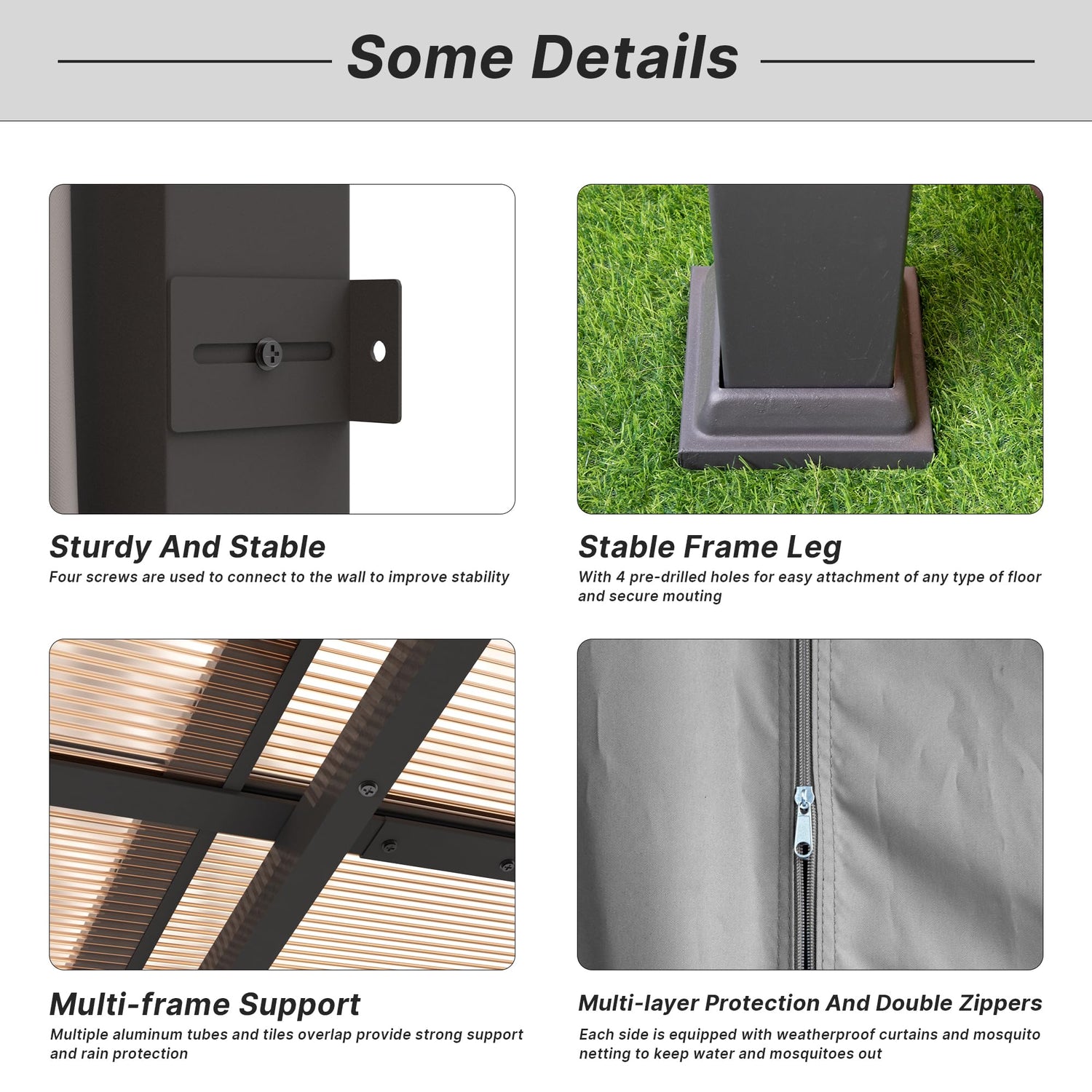 - Lean-to Gazebo:Designed with a sloping sun panel roof for optimal sun protection and effective water drainage.Includes double curtains to provide privacy and protection from insects and weather.