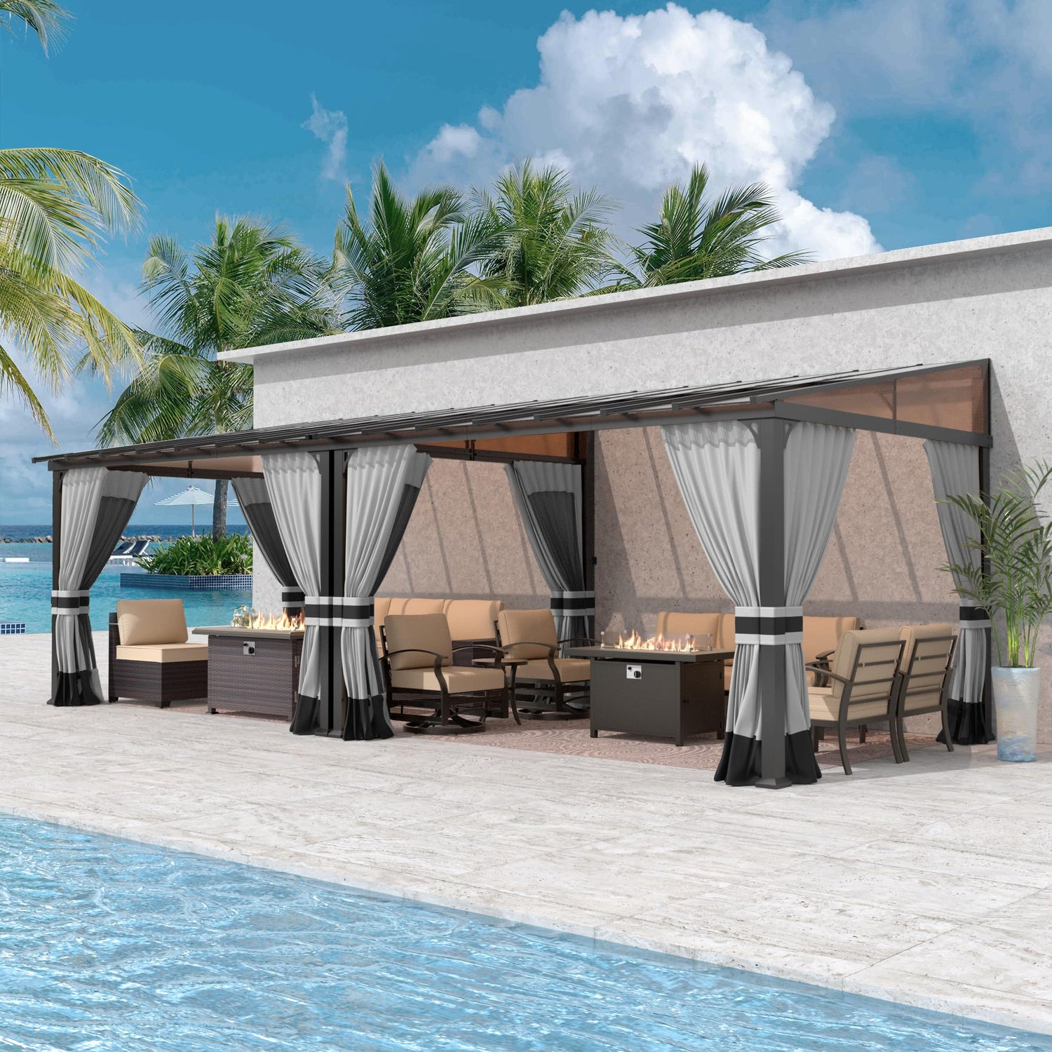 Gotland 10FTx24FT Outdoor Wall-Mounted Hardtop Pergola, Metal Frame Gazebo with Sloping Sun Panel Roof and Double Curtains for Patio, Garden, Lawn, Grey