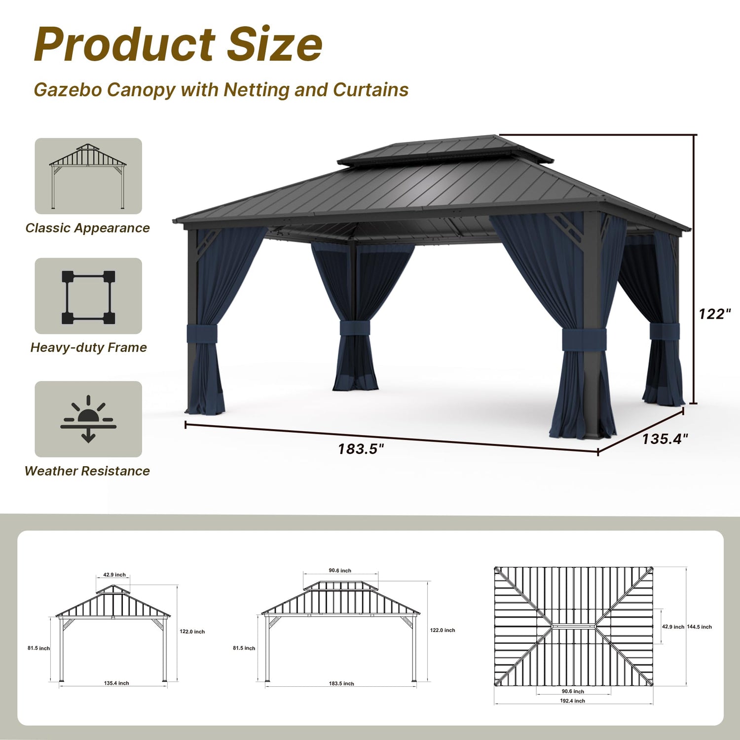 ②Hardtop gazebo made of sturdy galvanized steel, resistant to fading and rusting.