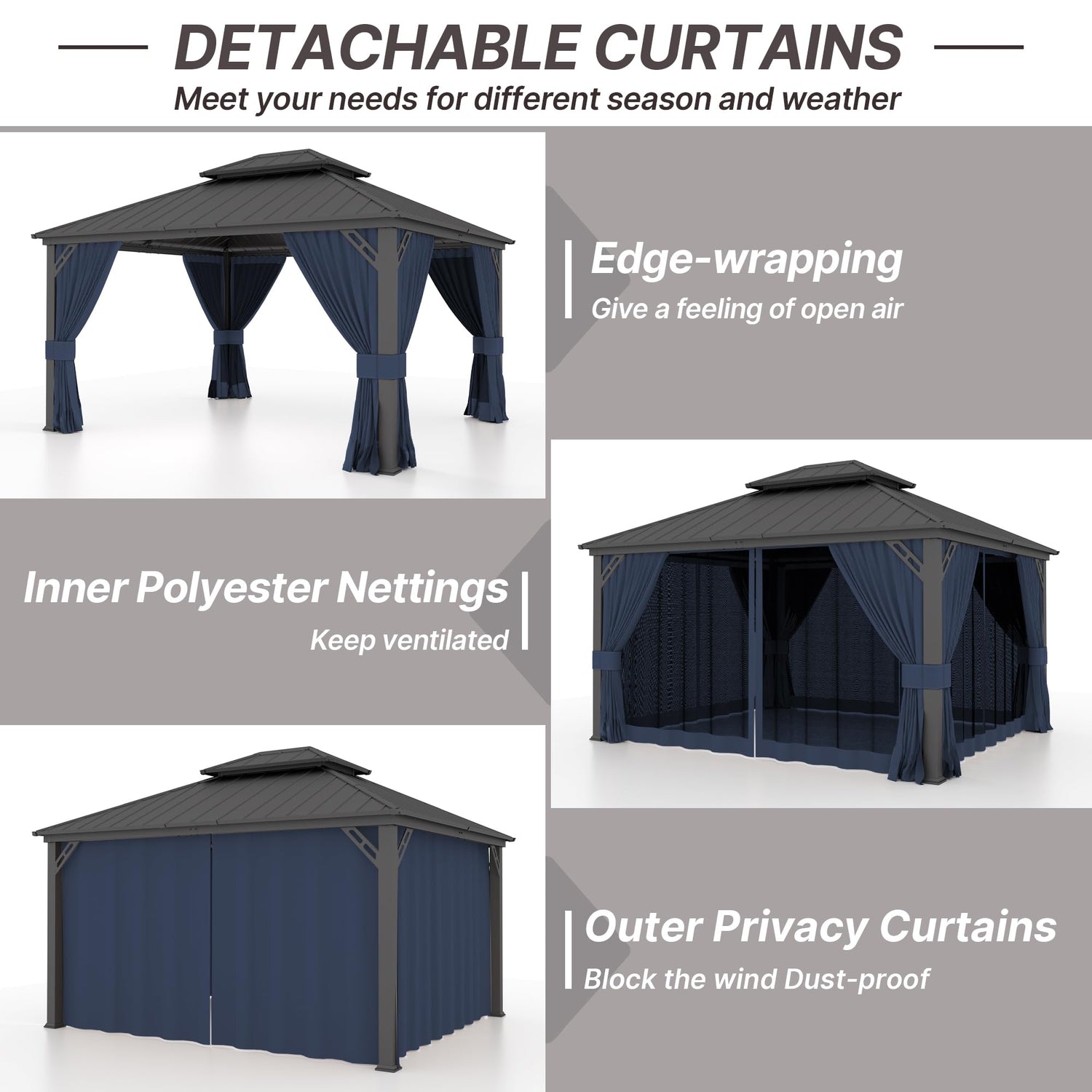 - NET CURTAIN & PRIVACY CURTAIN: Upgraded color woven polyester curtains and PBV coated polyester shades are attached with double tracks for switching at will. The zipper design allows the curtains to be removed for cleaning. The net curtains ensure good ventilation, the privacy curtains can effectively waterproof and UV protection at the same time, you can enjoy excellent privacy, the top of the gazebo is equipped with hooks that can be used to hang lights or fans.