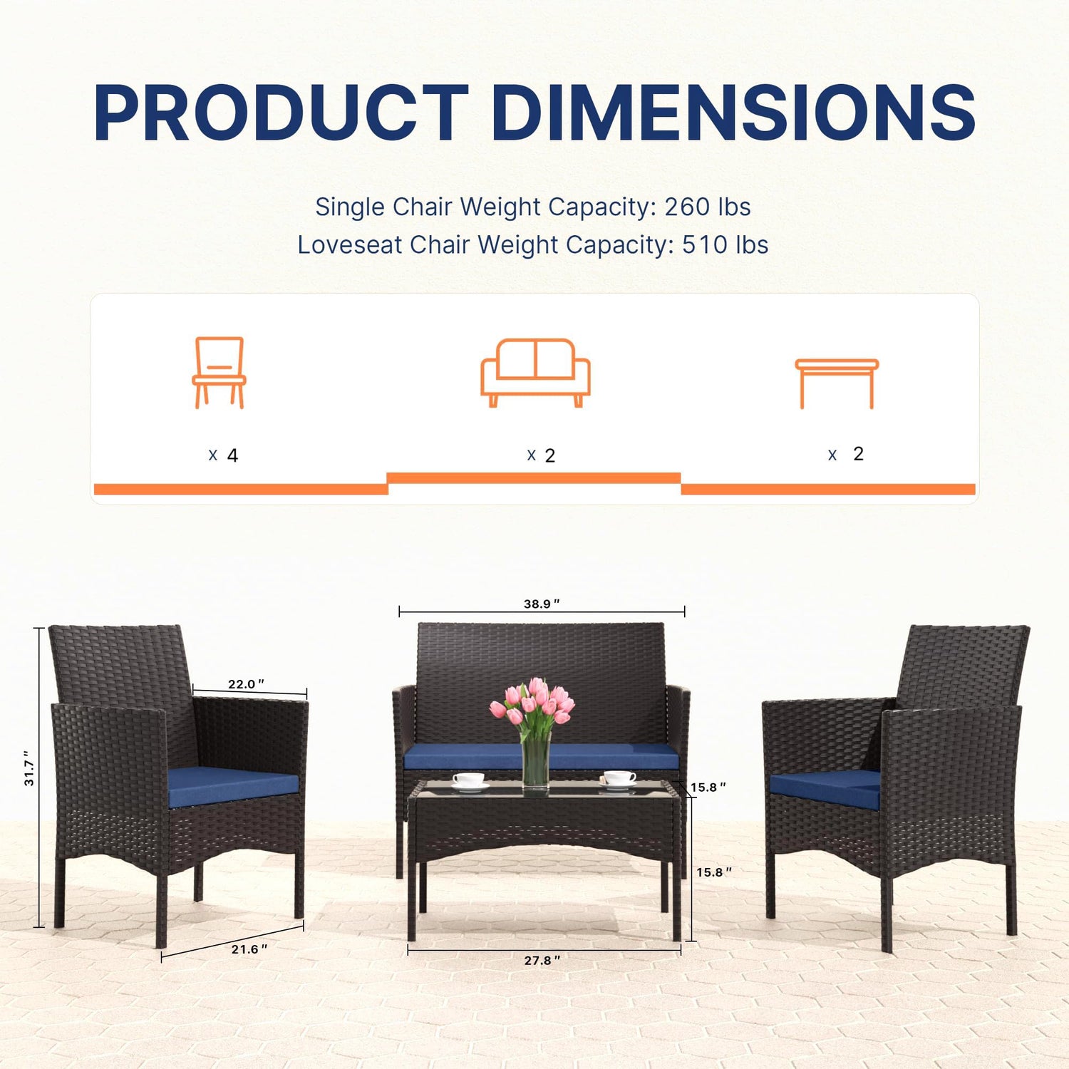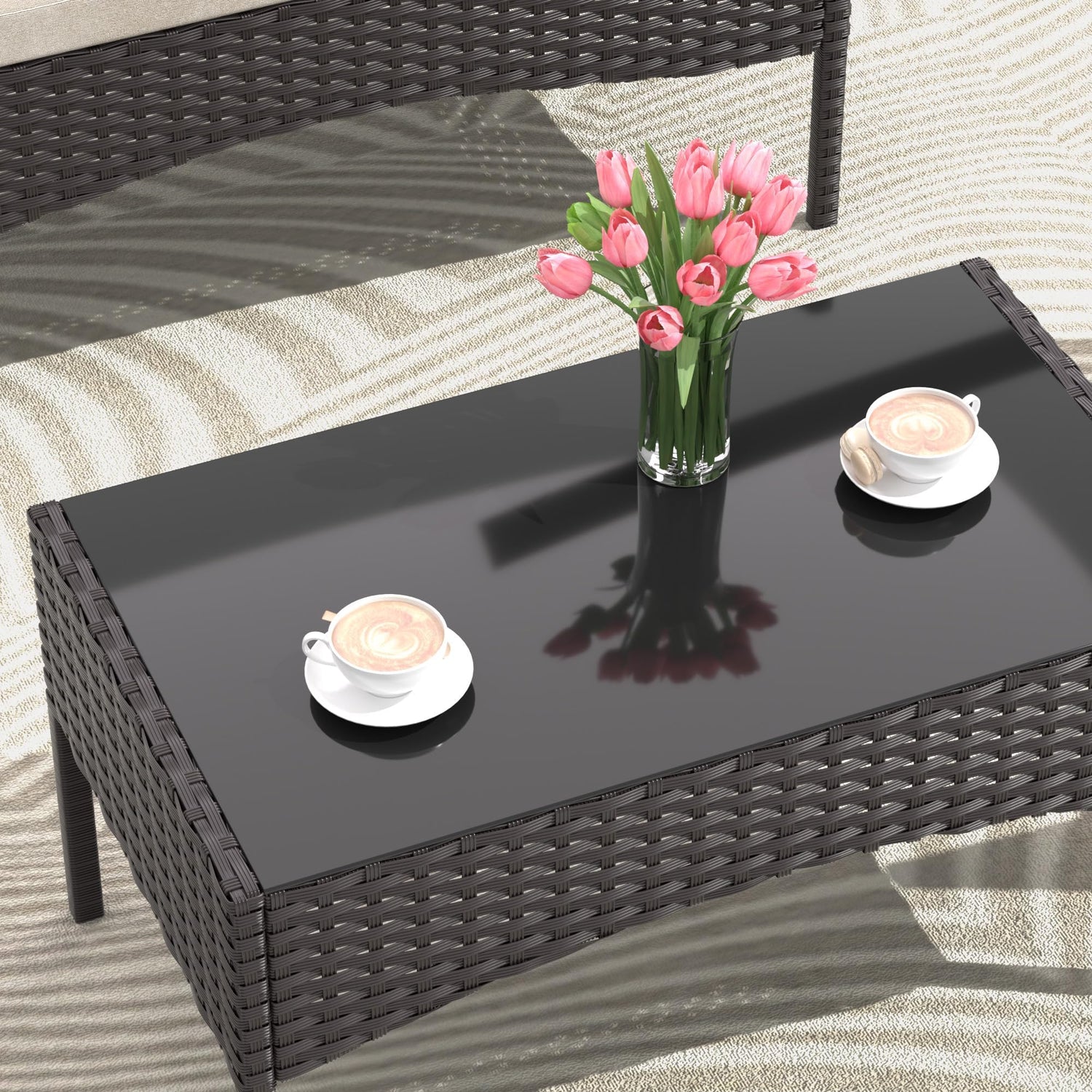 - Tempered Glass Coffee Table:Includes a modern coffee table with a durable tempered glass top, ideal for holding drinks, snacks, or décor to elevate your outdoor lounging experience.