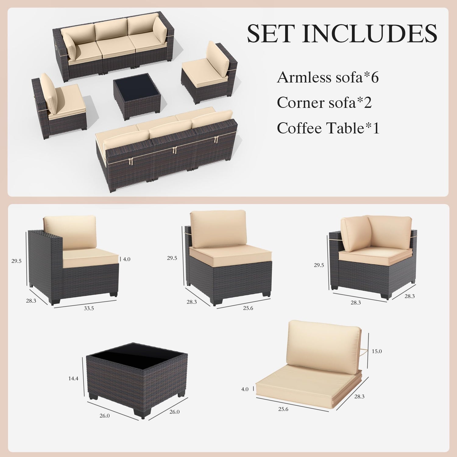 Gotland 9 Pieces Patio Furniture Set with 1 Coffee Table, Wicker Outdoor Sectional with 29.5'' High Backrest Thick Waterproof Cushions, Conversation Sets in 4 Combinations for Deck Pool Khaki