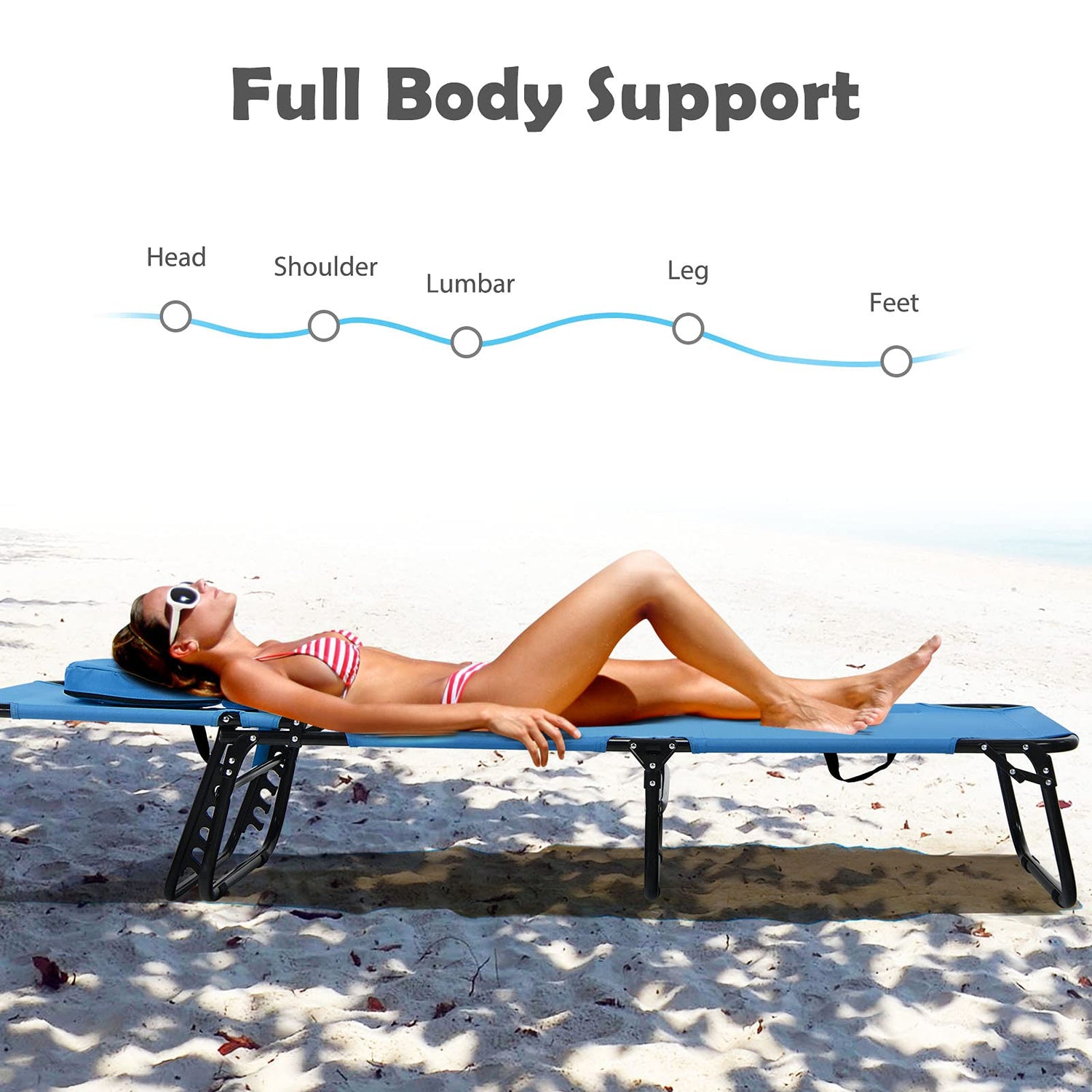 gotoplay Folding Beach Lounge Chair w/ 5 Adjutable Backrest & Padded Pillow, Sunbathing Lounger Chair, Sun Tanning Lay Flat Chair for Seaside Pool Deck, Max Load 330 LBS, No Assembly Required (Blue)