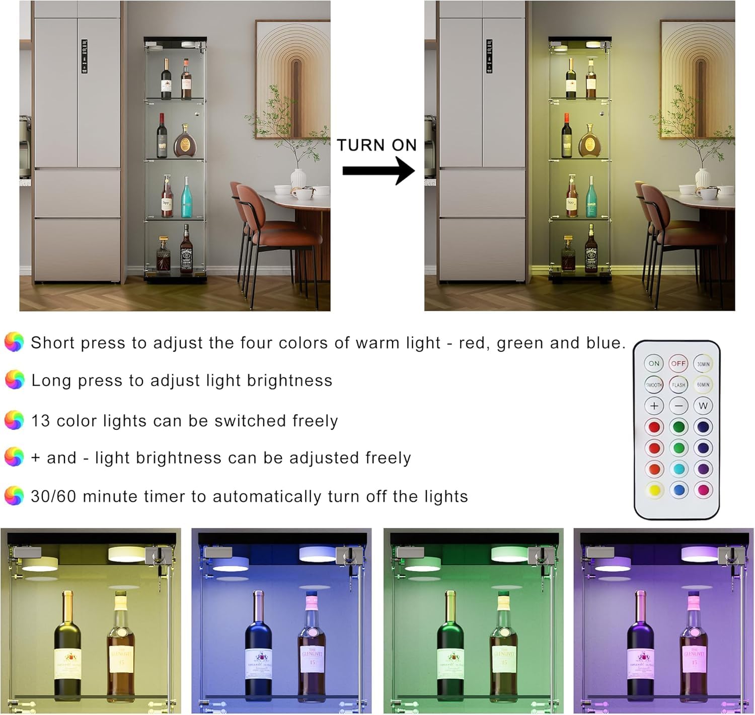 - ✔️【Glass Cabinet with LED Lights】 Dimensions 64.7"H x 16.7"W x 14.3"D. The display cabinet is made of 5mm Thick tempered glass, which is very sturdy and easy to clean, gives a clear and unhindered view of the items displayed inside. LED lights add a colorful ambience to your collectibles