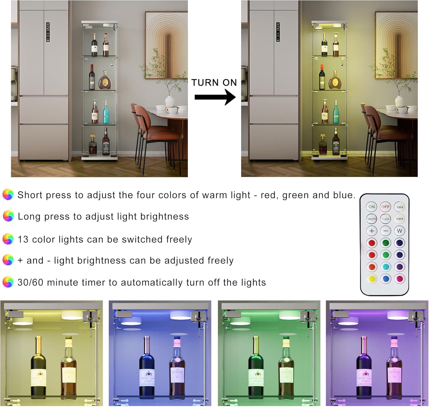 • ✔️【Glass Cabinet with LED Lights】 Dimensions 64.7"H x 16.7"W x 14.3"D. The display cabinet is made of 5mm Thick tempered glass, which is very sturdy and easy to clean, gives a clear and unhindered view of the items displayed inside. LED lights add a colorful ambience to your collectibles