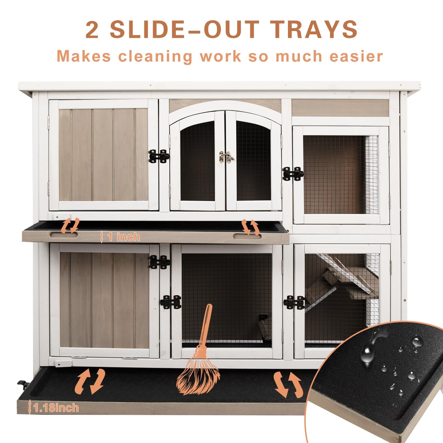 • 【EASY TO MOVE & NO LEAK TRAYS】Our rabbit cage is designed for your convenience. It is equipped with four lockable metal wheels that make it easy to move around within your indoor or outdoor spaces. The wheels also have a brake function that enhances safety during use. Additionally, two deep no-leak trays are included to simplify the cleaning process and keep your pets' living environment clean and healthy. You can effortlessly keep their home fresh.