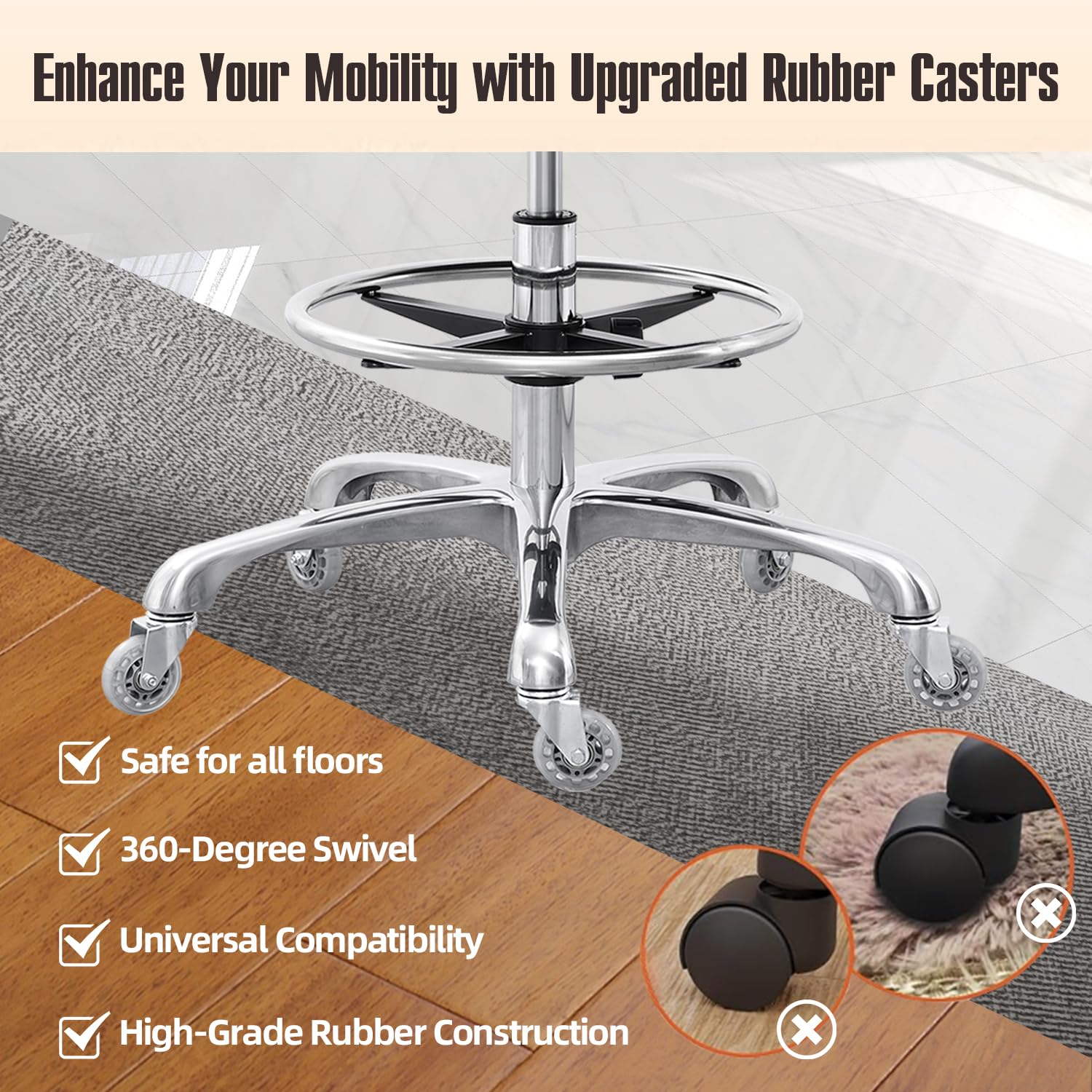 Seamless Glide Experience: The wheels on our drafting chair are among the smoothest on the market, designed for a seamless and effortless glide across various surfaces. These premium casters offer a whisper-quiet ride, ensuring a fluid motion without disrupting your workspace, making them ideal for any professional environment.