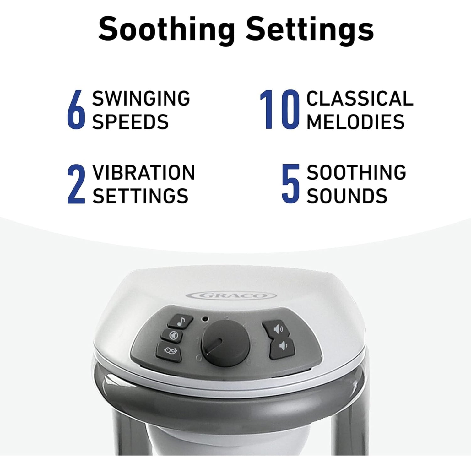 - 6 swinging speeds allow you to find the right pace; 2-speed vibration helps to soothe baby; 10 classic melodies and 5 nature sounds to delight and amuse; Mobile with 3 soft toys keeps baby entertained