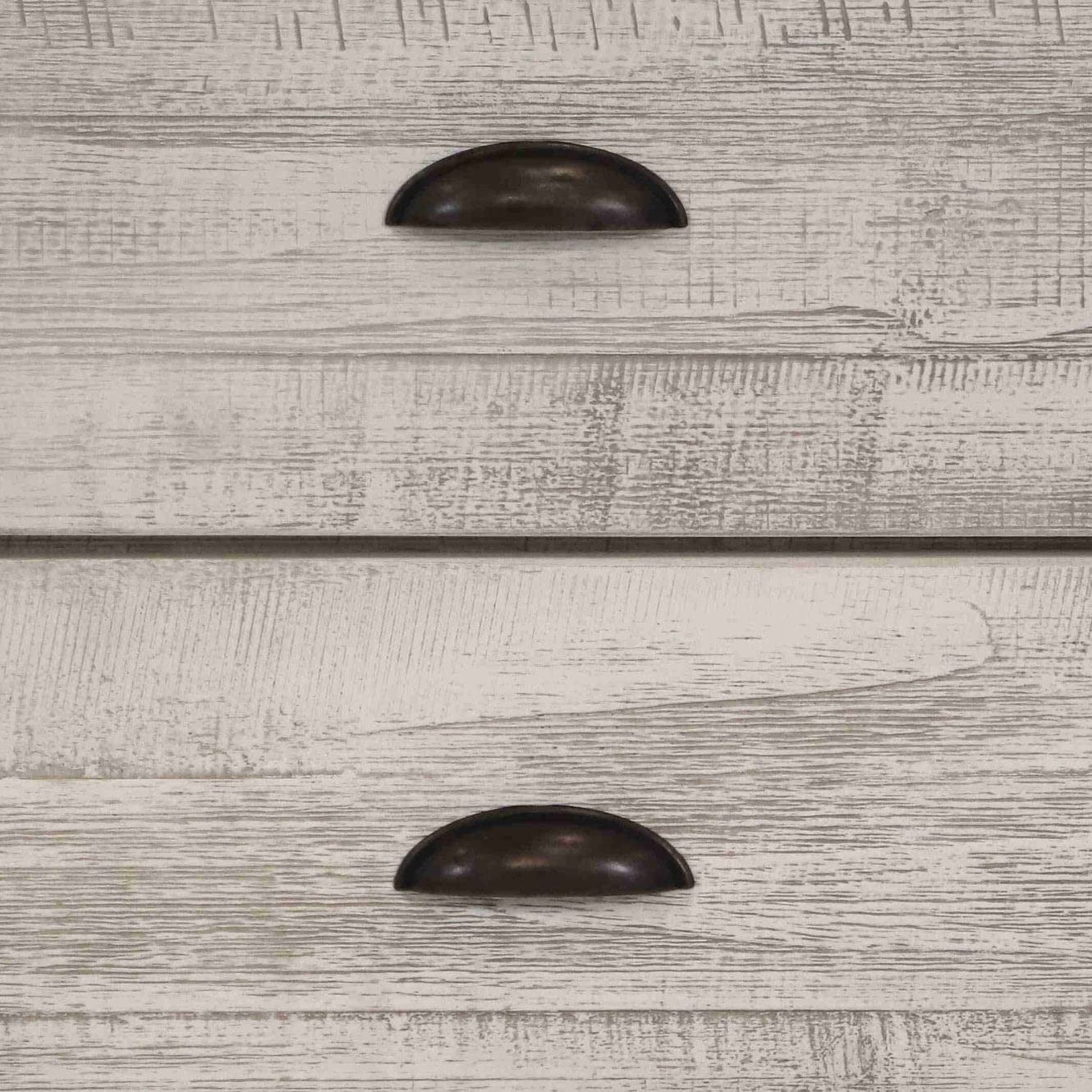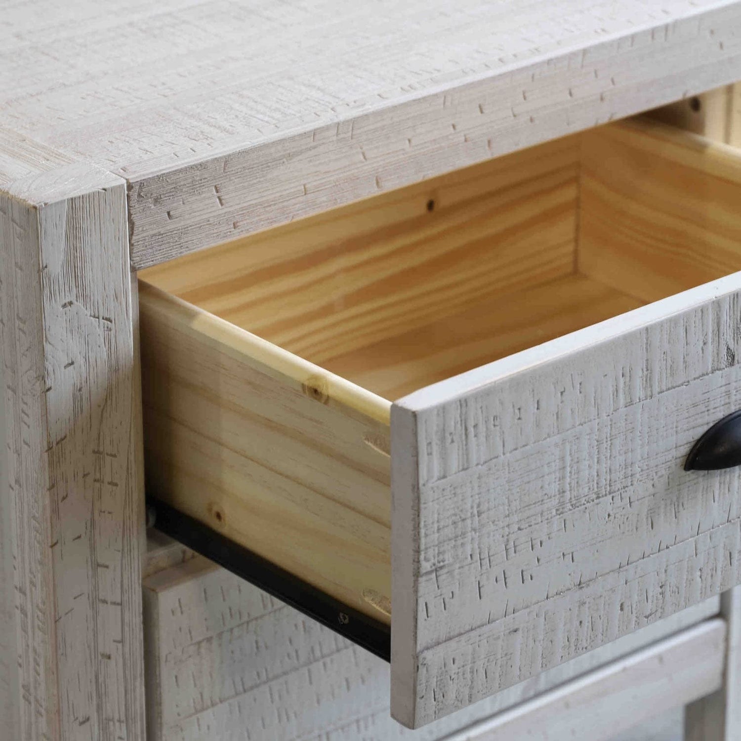 - Drawers feature metal glides and replaceable, rustic metal pulls.