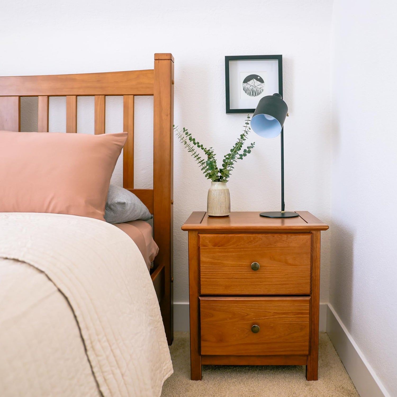 Attractive metal knobs, a rich finish, and elegant shaker style: this luxurious-looking nightstand has what it takes to give your bedroom that refined touch. Its modernized traditional style creates a timeless décor, while adding lots of storage with two spacious 6 1/2” deep drawers. Made of 100% solid pine wood, this nightstand features a sturdy construction that can last for years.