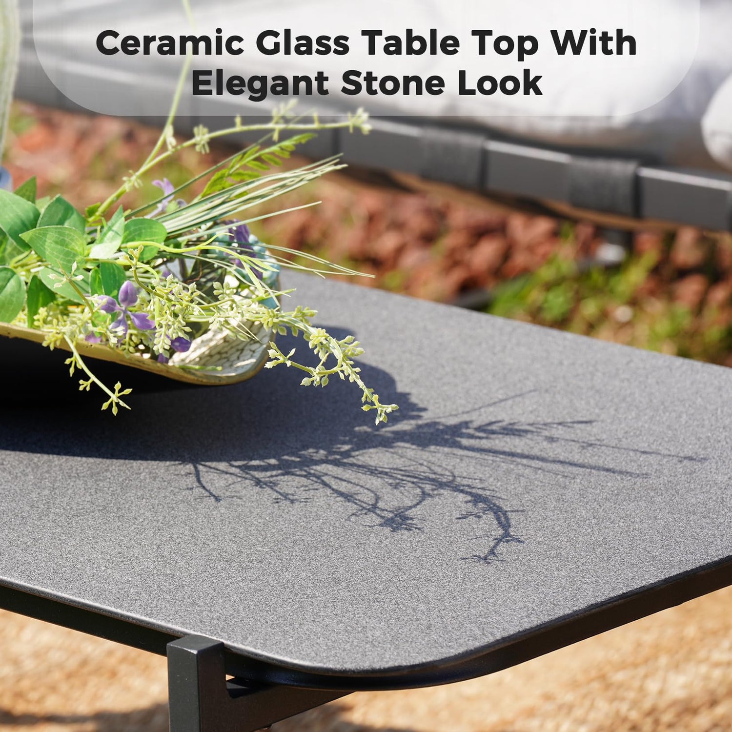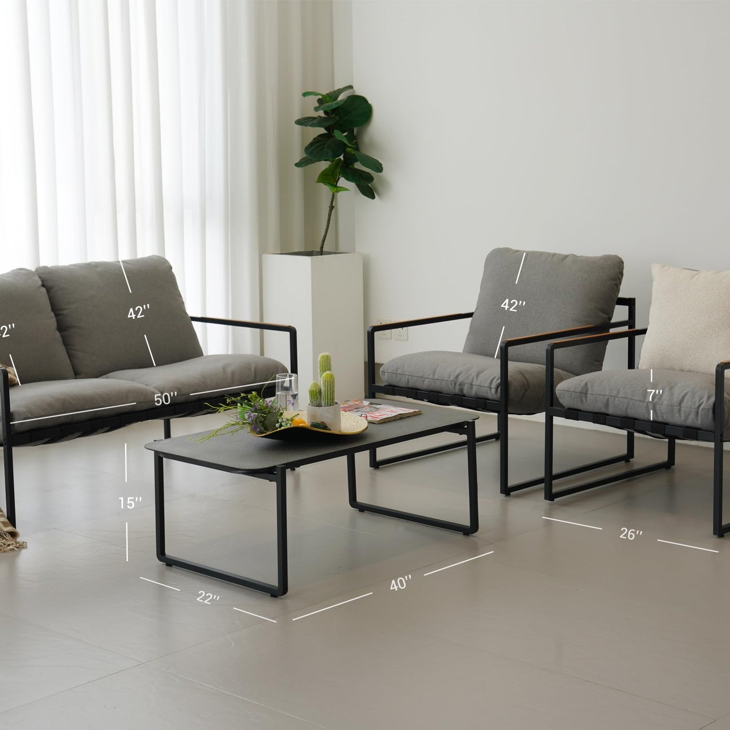 - Modern & Stylish: The combination of minimalist lines and walnut wood grain armrests makes the patio sofa set modern and elegant. The glass-ceramic coffee table features a dark gray stone-patterned texture for a luxurious look and close to nature