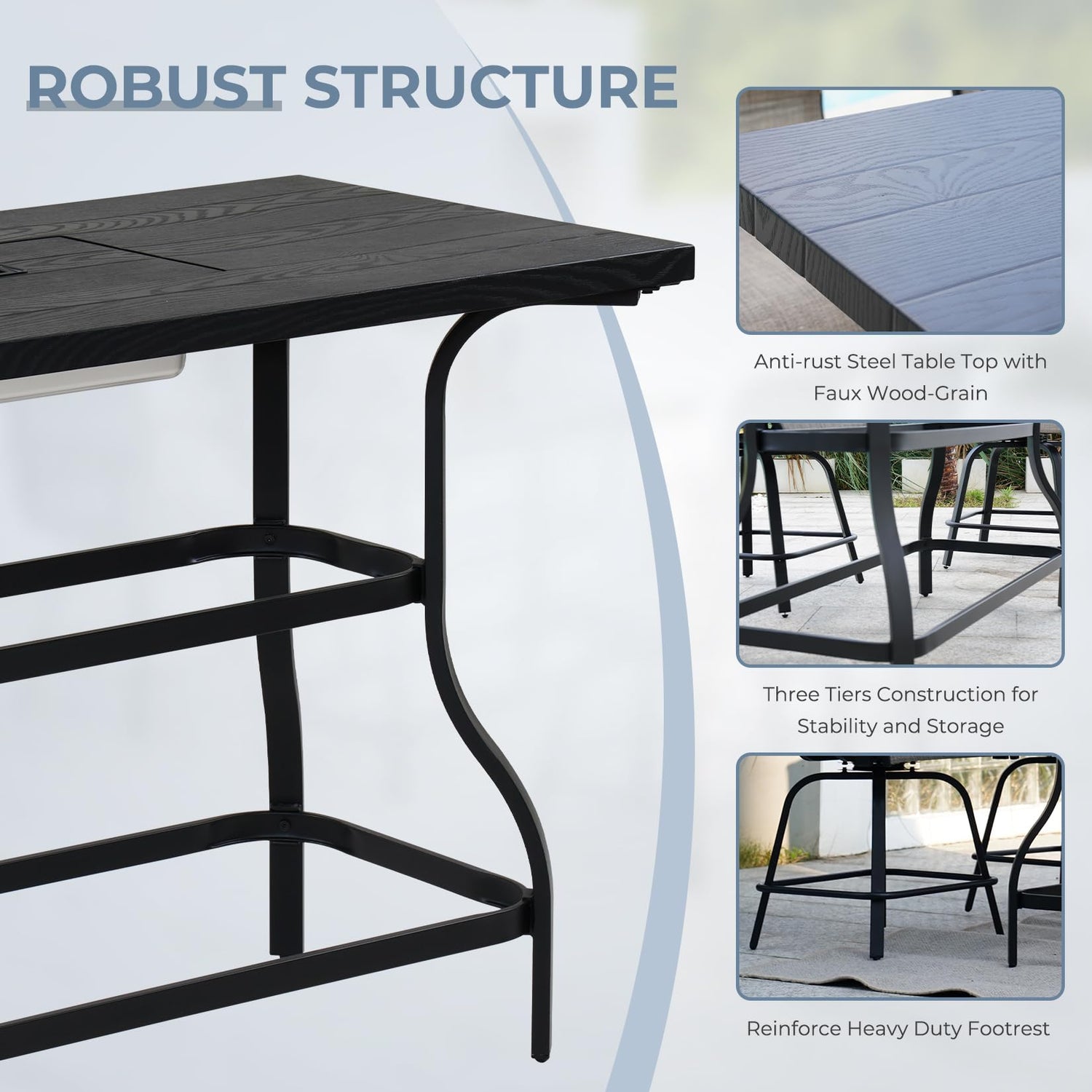 Constructed with robustness in mind, the set showcases a stylish design coupled with stable construction. The tabletop features slats with a faux wood grain finish that adds a warm touch. A rust-resistant coating ensures easy maintenance, allowing you to spend less time cleaning and more time enjoying. With three layers of ultra-stable construction, the high bar table not only provides a solid surface but also includes a crossbar at the bottom for resting your feet.