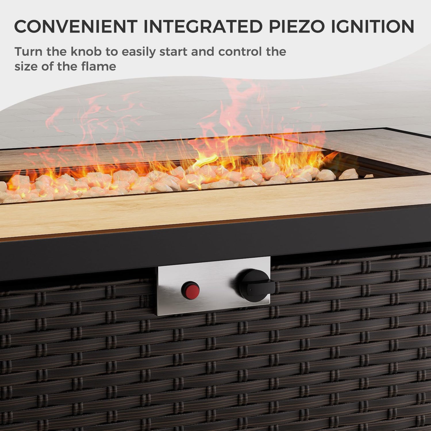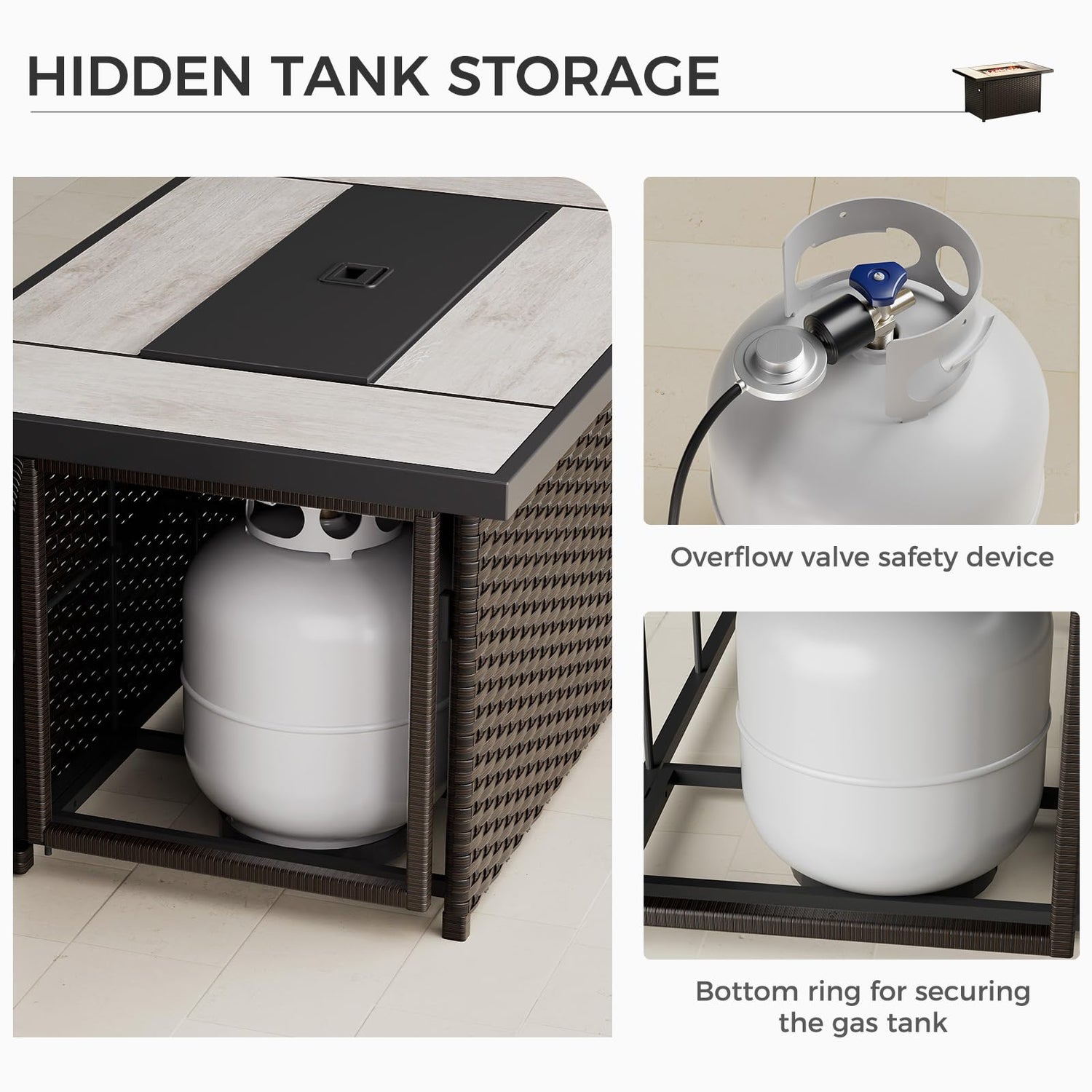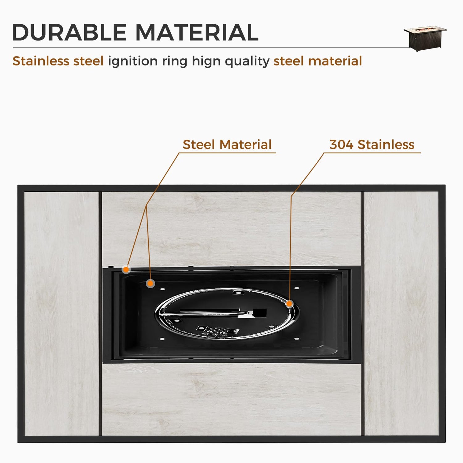 - SAFETY & HEAT OUTPUT: Each outside fire pit table is CSA certified, ensuring safety and reliability while delivering up to 50,000 BTU/h of high heat output for a warm and cozy atmosphere. The flame adjustment knob allows precise control over flame size and temperature. Clean-burning fuel eliminates smoke and dust concerns, and the integrated propane tank storage box (gas connection pipe length: 305 cm) maintains a clean and sleek appearance, combining aesthetics with practicality