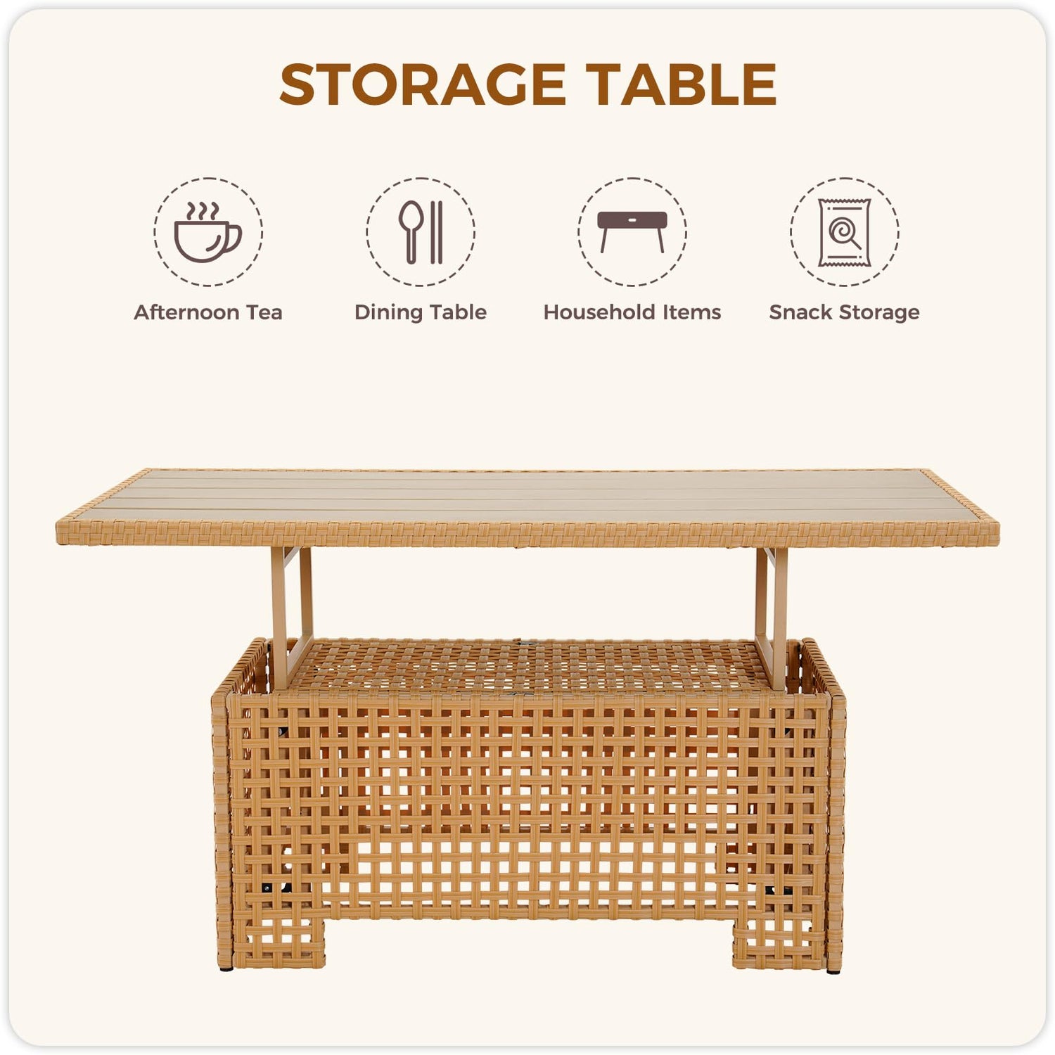 - DUAL-PURPOSE & STORAGE: Featuring a liftable top design, this patio coffee table effortlessly converts into a dining table. The integrated storage shelf, accessible when the table is lifted, is ideal for keeping snacks, magazines, blankets, pillows, furniture covers, and more organized.