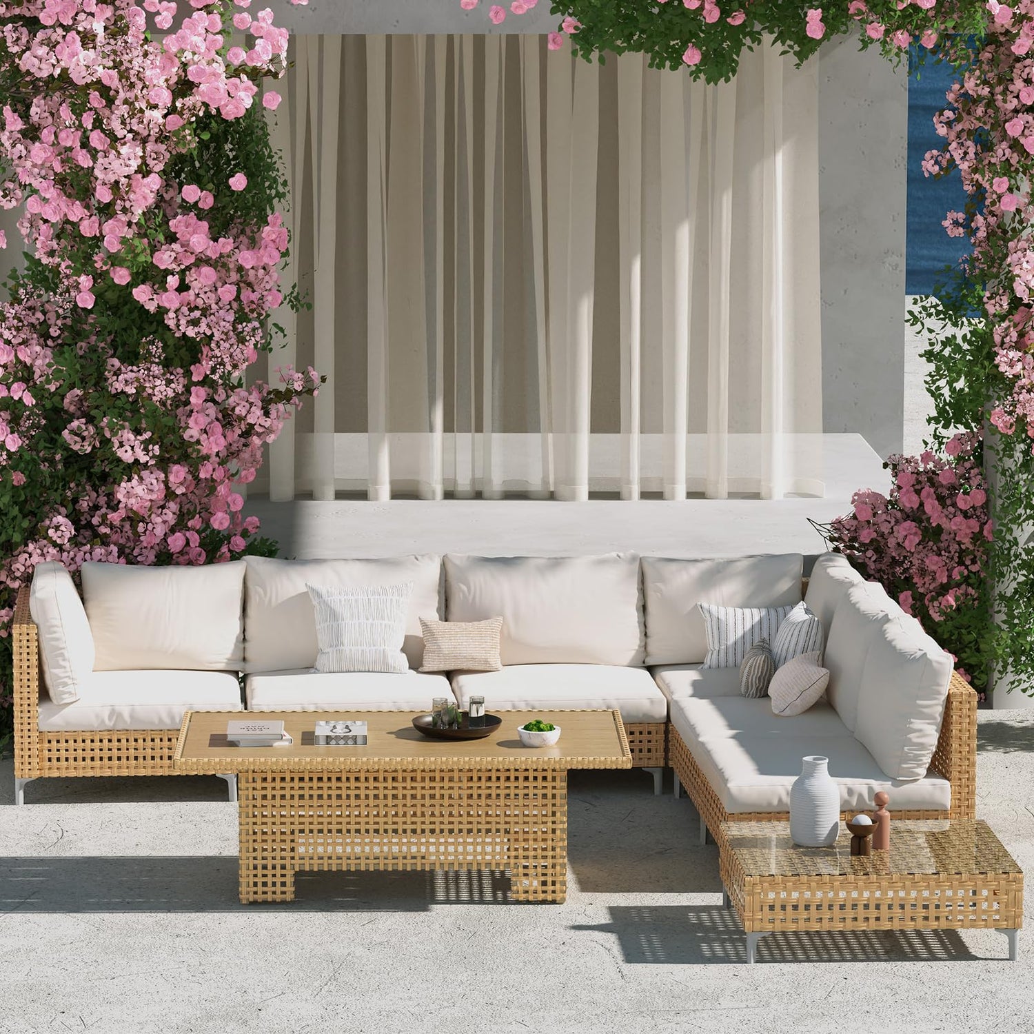 - BOHO & STYLISH DESIGN: Featuring beige cushions and matching beige wicker, this patio sofa set boasts a modern neutral color combination. Its modular sofa design allows you to customize the seating arrangement and securely lock them together. With its relaxing boho and beach look, this set effortlessly blends with any home decor.