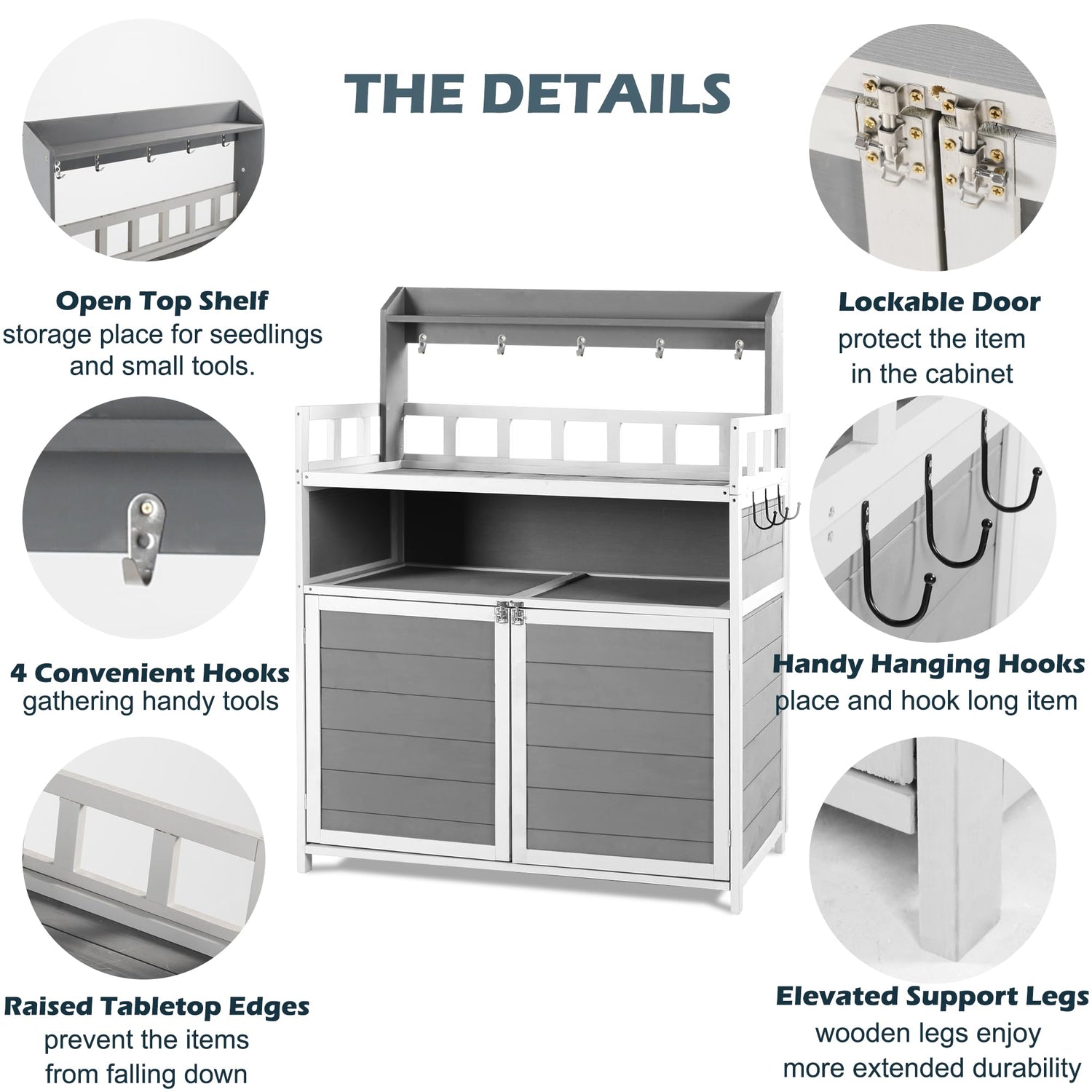 - [Designed For Your Garden] For the serious gardener, this outdoor potting bench table is not only a stylish and convenient place to cut stems, water plants, or create floral masterpieces without constantly bending over and causing back strain but also be an outdoor storage cabinet, large storage space that can hold a variety of tools and equipment that are required to make potting easier. This garden table comes with 3 removable hooks and 5 fixed hooks.